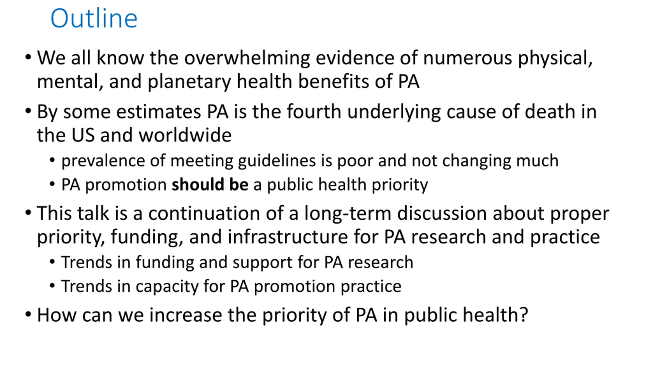 Outline We all know the overwhelming evidence of numerous physical, mental, and planetary health benefits of PA By some estimates PA is the fourth underlying cause of death in the US and worldwide prevalence of meeting guidelines is poor and not changing much PA promotion should be a public health priority This talk is a continuation of a long-term discussion about proper priority, funding, and infrastructure for PA research and practice Trends in funding and support for PA research Trends in capacity for PA promotion practice How can we increase the priority of PA in public health?