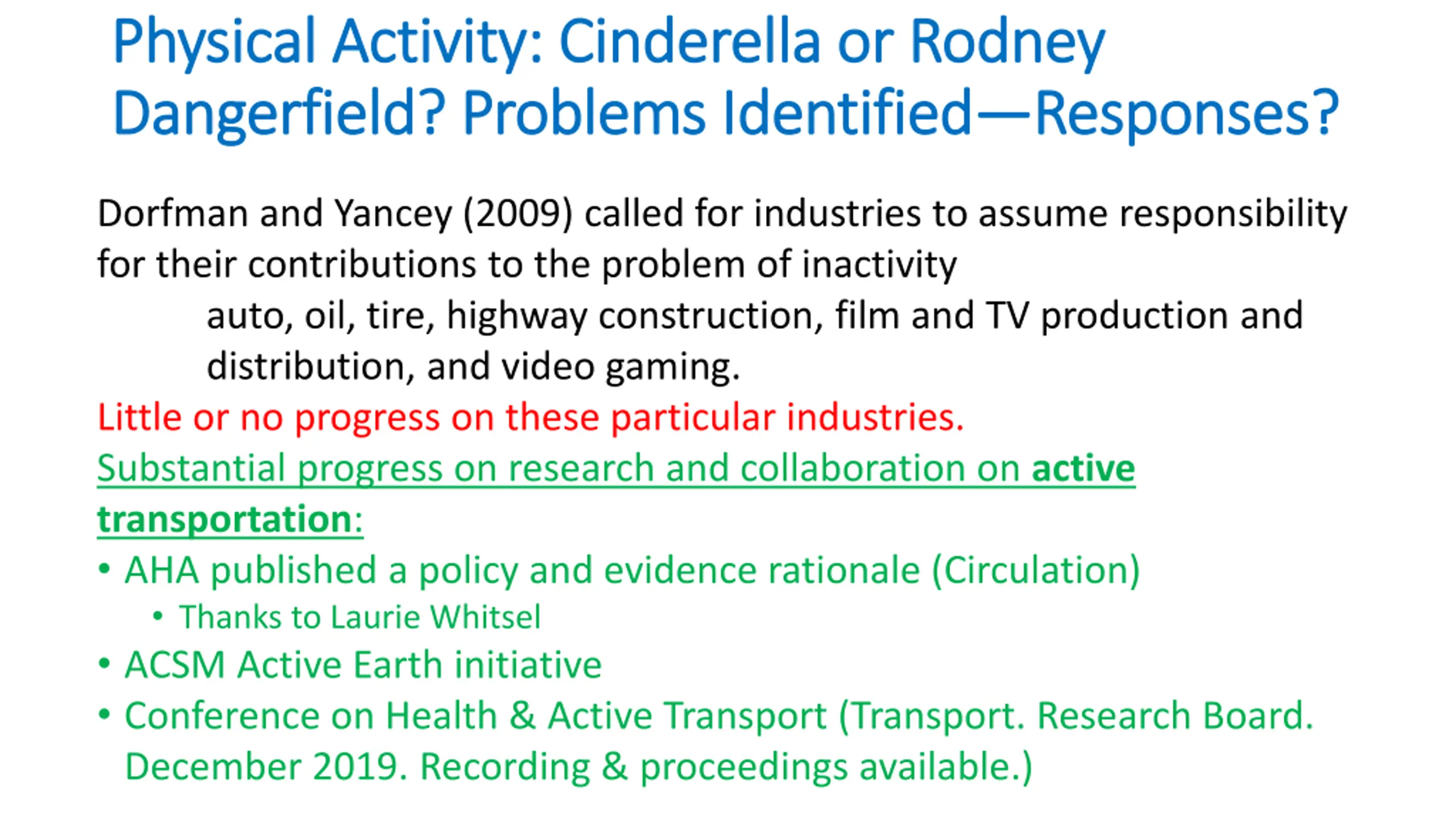 Physical Activity: Cinderella or Rodney Physical Activity: Cinderella or Rodney Dangerfield Dangerfield? Problems Identified ? Problems Identified Responses? Responses? Dorfman and Yancey (2009) called for industries to assume responsibility for their contributions to the problem of inactivity auto, oil, tire, highway construction, film and TV production and distribution, and video gaming. Little or no progress on these particular industries. Substantial progress on research and collaboration on active transportation: AHA published a policy and evidence rationale (Circulation) Thanks to Laurie Whitsel ACSM Active Earth initiative Conference on Health & Active Transport (Transport. Research Board. December 2019. Recording & proceedings available.)