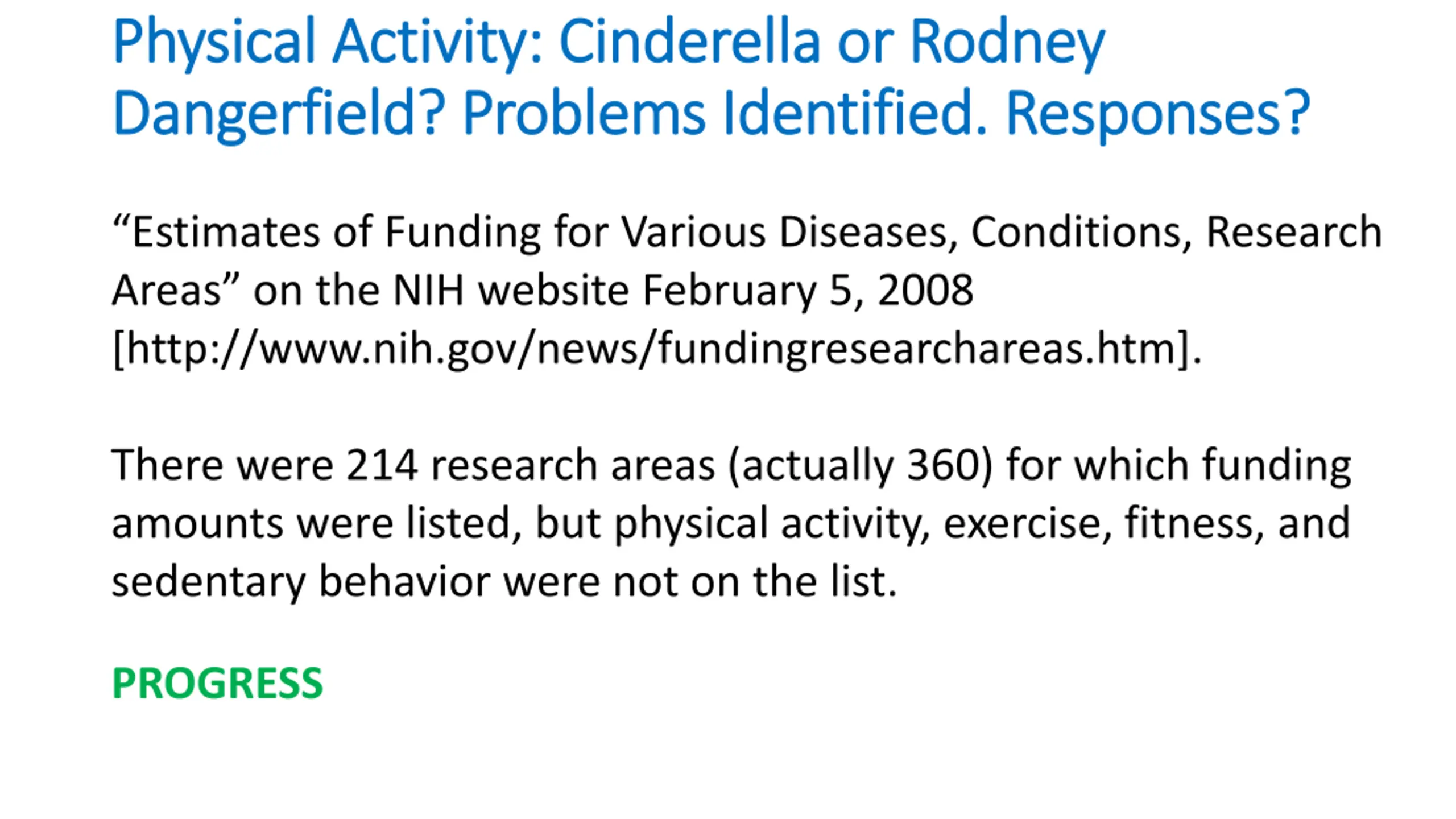 Physical Activity: Cinderella or Rodney Physical Activity: Cinderella or Rodney Dangerfield Dangerfield? Problems Identified. Responses? ? Problems Identified. Responses? Estimates of Funding for Various Diseases, Conditions, Research Areas on the NIH website February 5, 2008 [http://www.nih.gov/news/fundingresearchareas.htm]. There were 214 research areas (actually 360) for which funding amounts were listed, but physical activity, exercise, fitness, and sedentary behavior were not on the list. PROGRESS