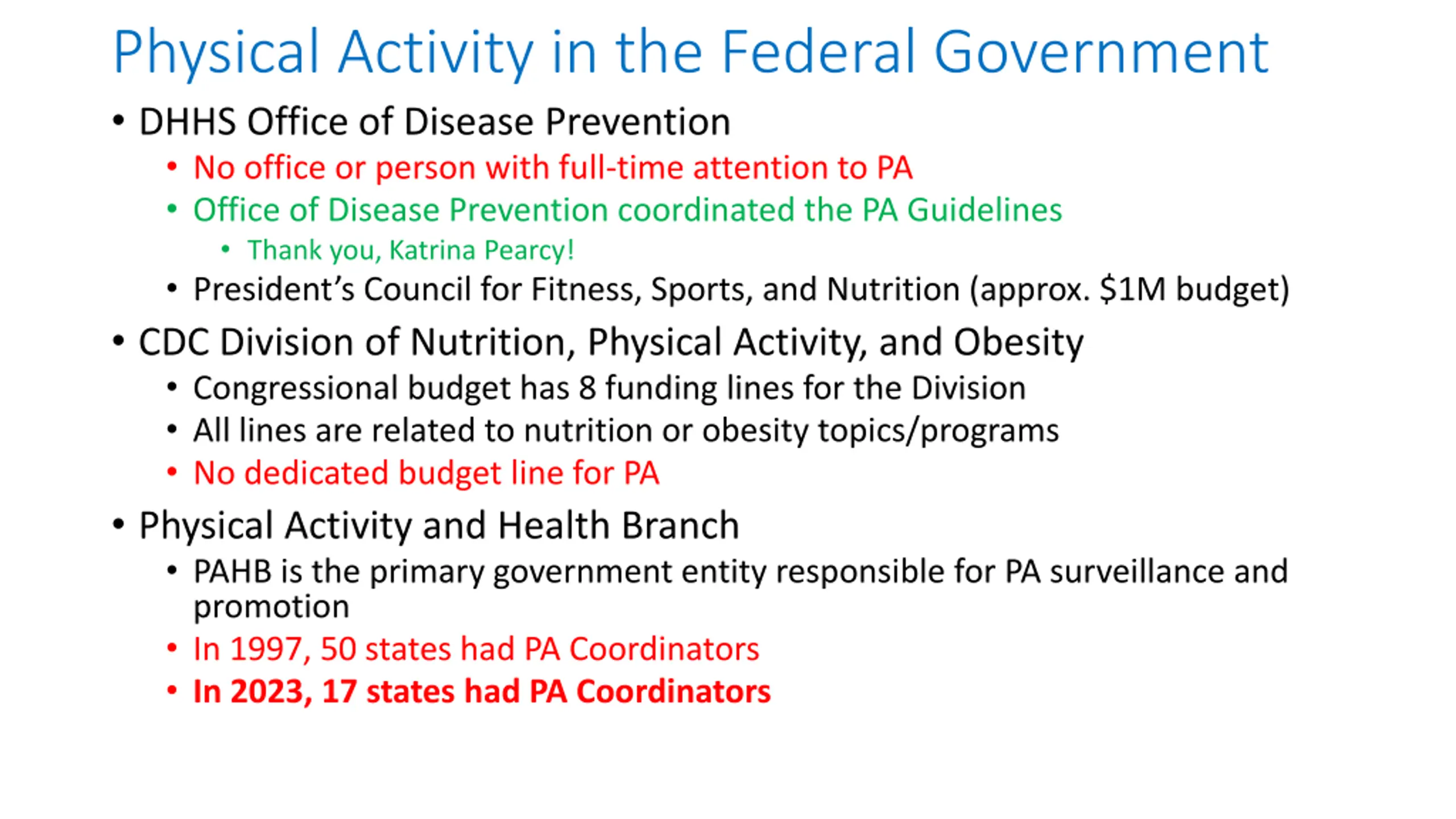 Physical Activity in the Federal Government DHHS Office of Disease Prevention No office or person with full-time attention to PA Office of Disease Prevention coordinated the PA Guidelines Thank you, Katrina Pearcy! President s Council for Fitness, Sports, and Nutrition (approx. $1M budget) CDC Division of Nutrition, Physical Activity, and Obesity Congressional budget has 8 funding lines for the Division All lines are related to nutrition or obesity topics/programs No dedicated budget line for PA Physical Activity and Health Branch PAHB is the primary government entity responsible for PA surveillance and promotion In 1997, 50 states had PA Coordinators In 2023, 17 states had PA Coordinators
