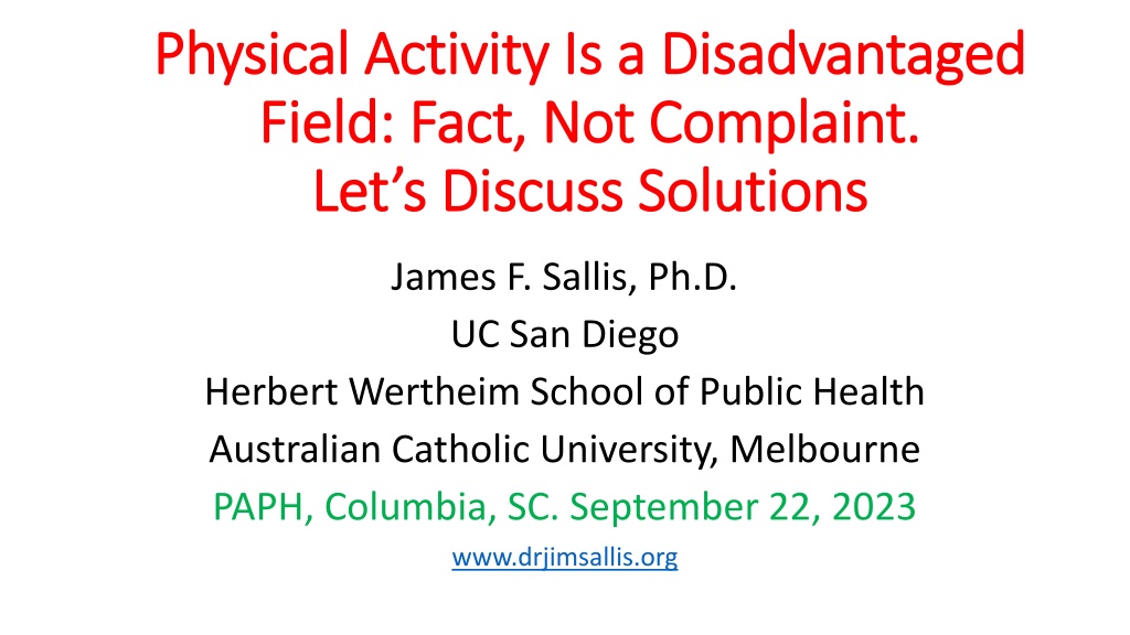 Physical Physical Activity Is a Disadvantaged Activity Is a Disadvantaged Field Field: : Fact Fact, , Not Complaint. Not Complaint. Let s Discuss Solutions Let s Discuss Solutions James F. Sallis, Ph.D. UC San Diego Herbert Wertheim School of Public Health Australian Catholic University, Melbourne PAPH, Columbia, SC. September 22, 2023 www.drjimsallis.org
