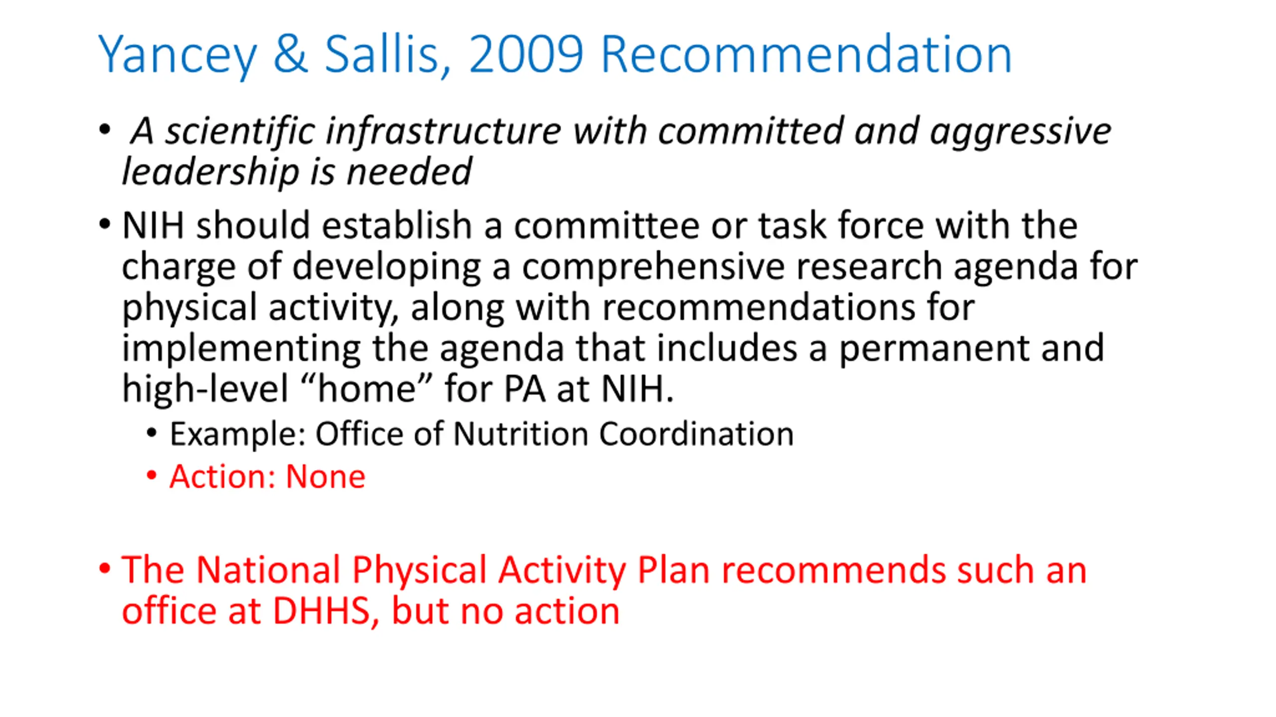 Yancey & Sallis, 2009 Recommendation A scientific infrastructure with committed and aggressive leadership is needed NIH should establish a committee or task force with the charge of developing a comprehensive research agenda for physical activity, along with recommendations for implementing the agenda that includes a permanent and high-level home for PA at NIH. Example: Office of Nutrition Coordination Action: None The National Physical Activity Plan recommends such an office at DHHS, but no action