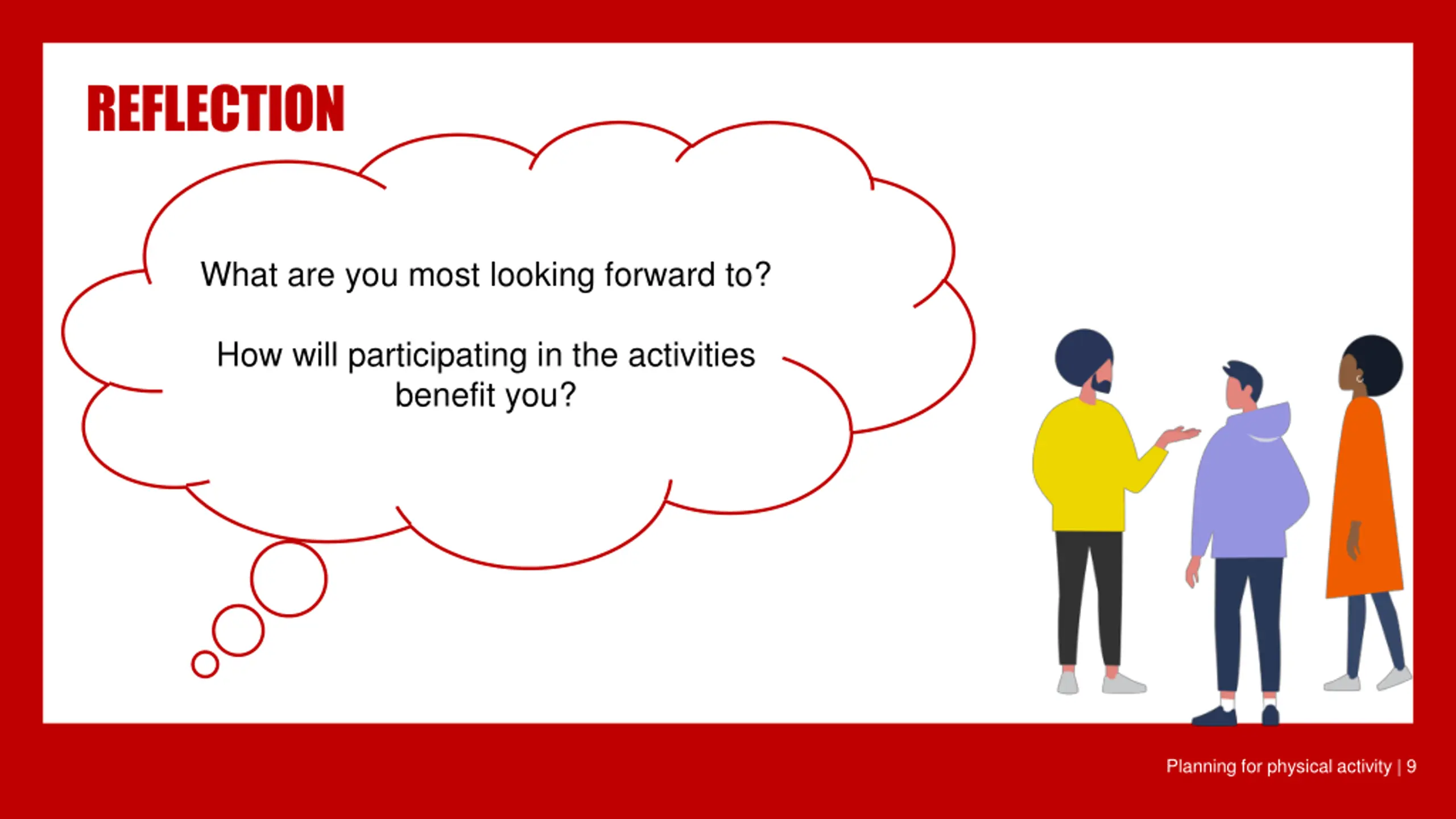 REFLECTION What are you most looking forward to? How will participating in the activities benefit you? Planning for physical activity | 9