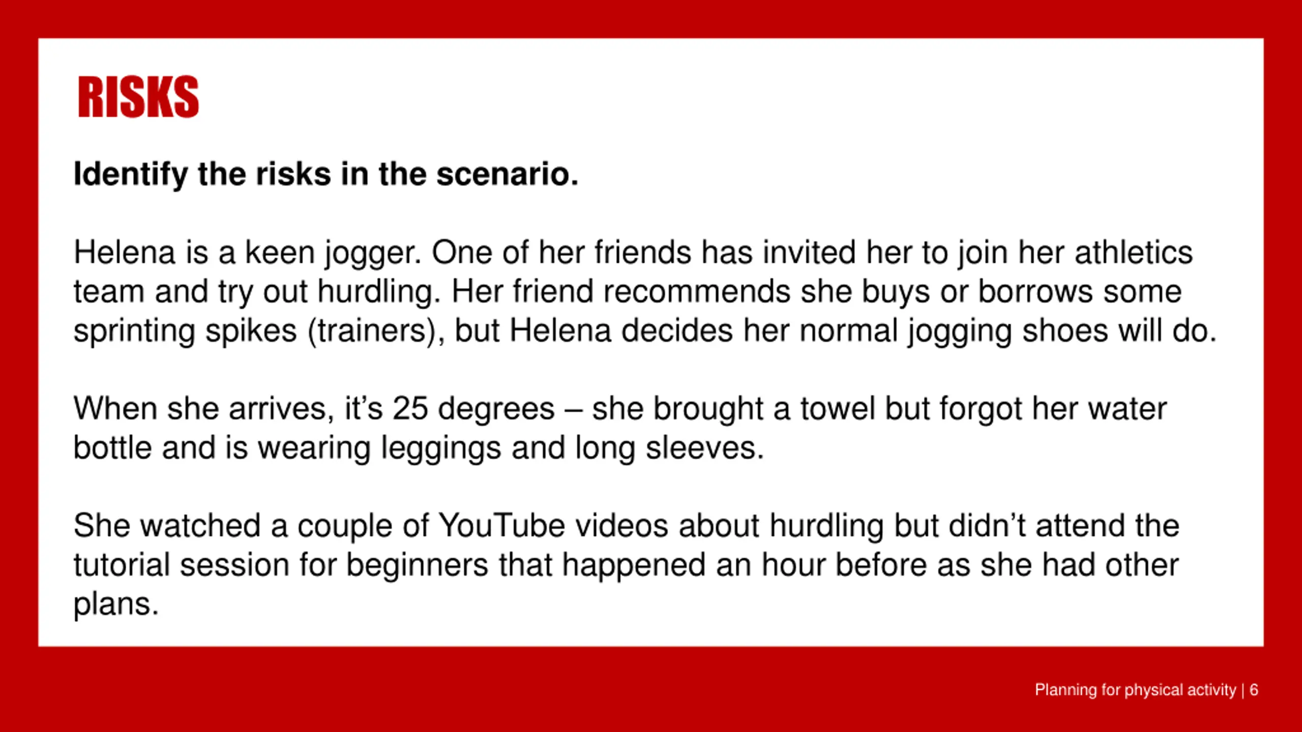 RISKS Identify the risks in the scenario . Helena is a keen jogger. One of her friends has invited her to join her athletics team and try out hurdling. Her friend recommends she buys or borrows some sprinting spikes (trainers), but Helena decides her normal jogging shoes will do. When she arrives, it s 25 degrees she brought a towel but forgot her water bottle and is wearing leggings and long sleeves. She watched a couple of YouTube videos about hurdling but didn t attend the tutorial session for beginners that happened an hour before as she had other plans. Planning for physical activity | 6