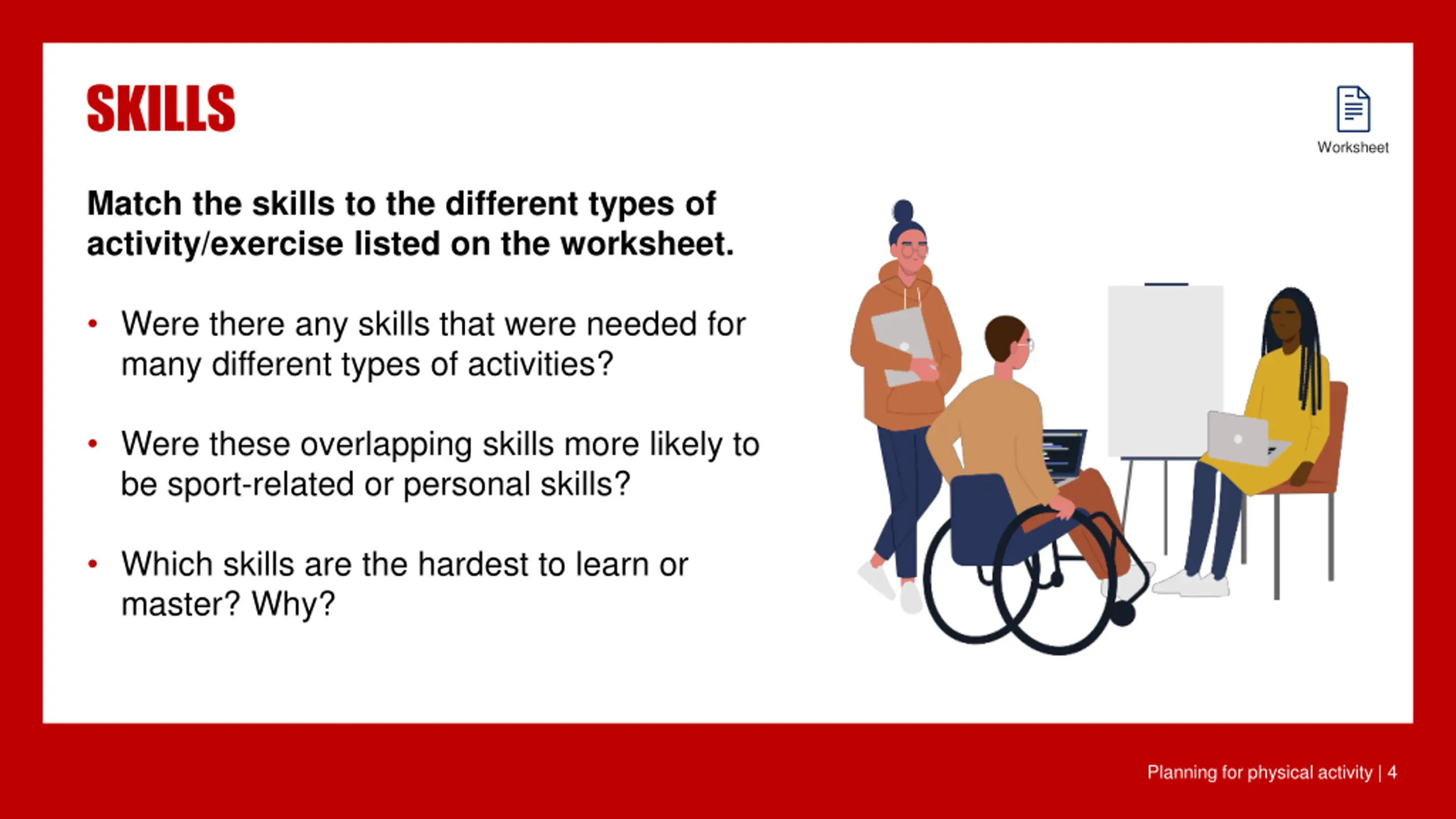 SKILLS Worksheet Match the skills to the different types of activity/exercise listed on the worksheet. Were there any skills that were needed for many different types of activities? Were these overlapping skills more likely to be sport-related or personal skills? Which skills are the hardest to learn or master? Why? Planning for physical activity | 4
