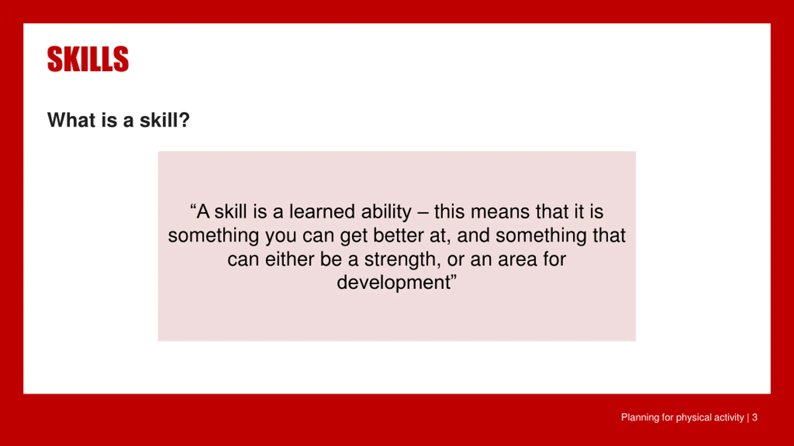 SKILLS What is a skill? A skill is a learned ability this means that it is something you can get better at, and something that can either be a strength, or an area for development Planning for physical activity | 3