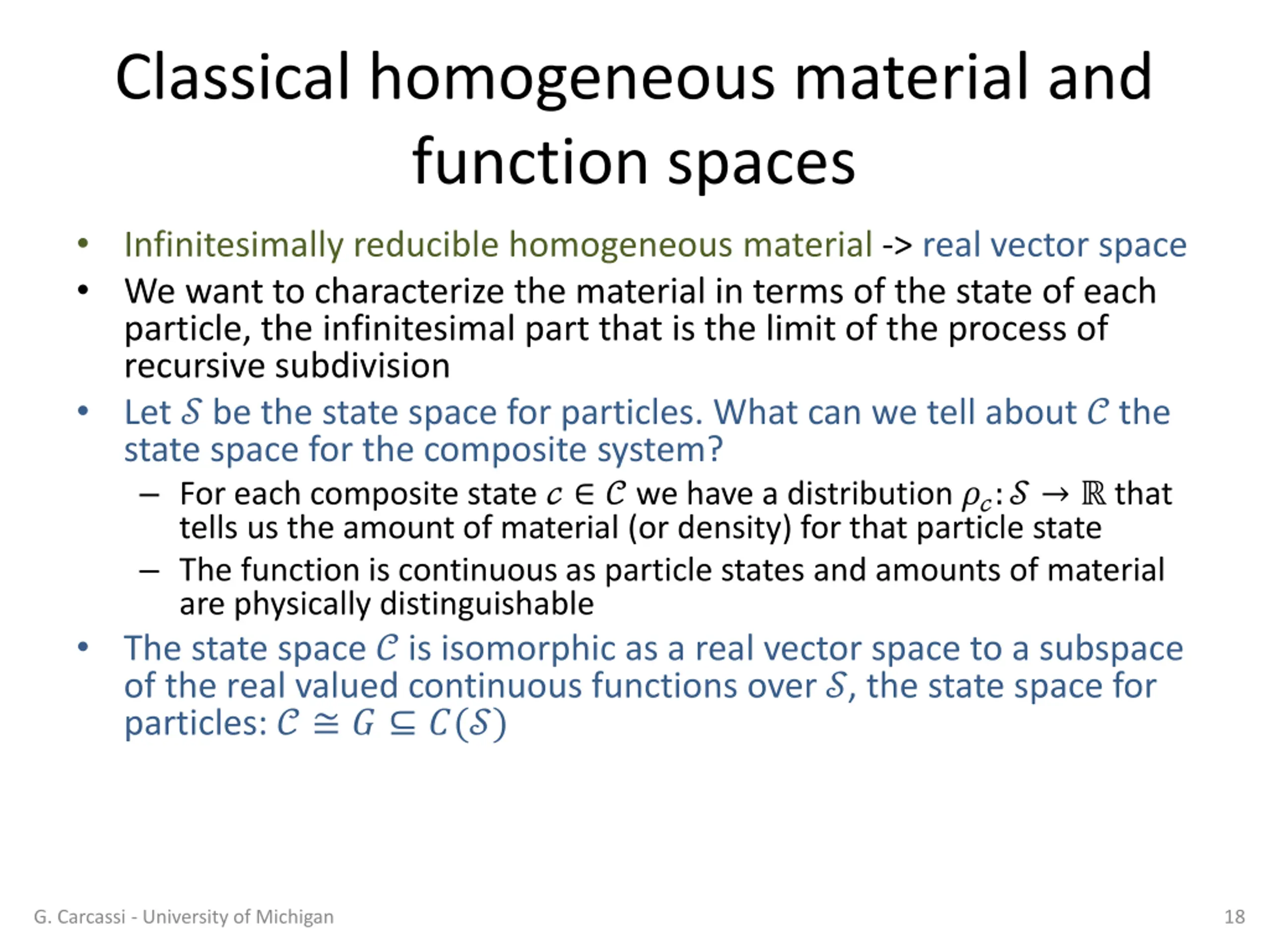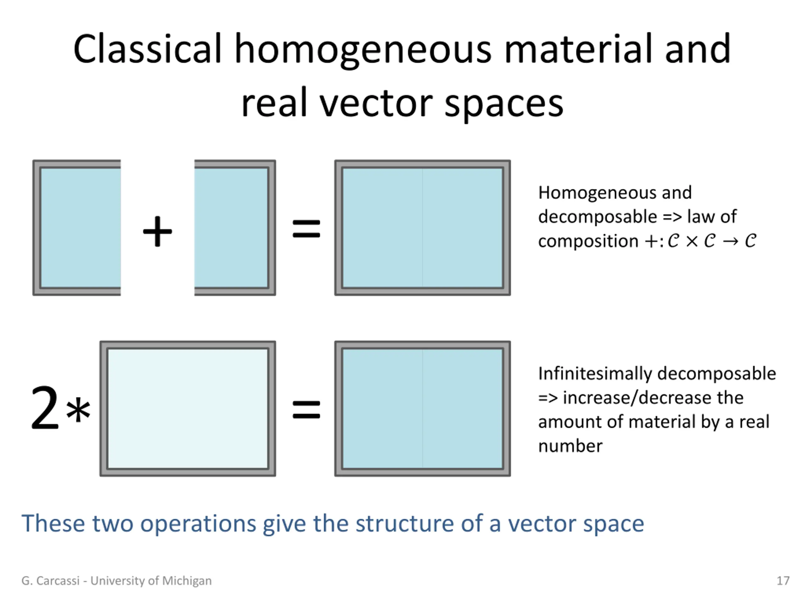 Classical homogeneous material and real vector spaces A classical material is: Decomposable: can be divided into smaller amounts Infinitesimally so: can keep dividing arbitrarily ( particles are the limits of such division) Reducible: giving state of whole equivalent to giving state of parts Homogeneous: state space of each part is the same A classical fluid is an example How do we mathematically capture the structure of such material? G. Carcassi - University of Michigan 16