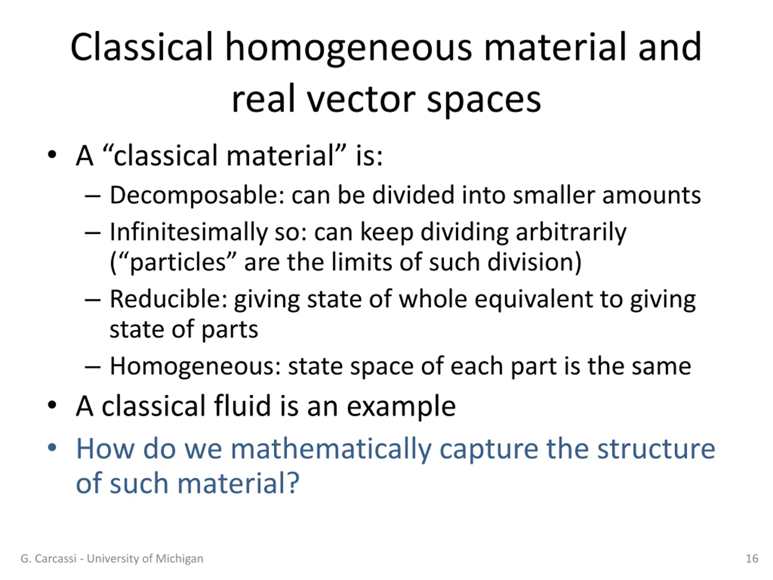 Assumption II: infinitesimal reducibility (classical material) The system is composed of a homogeneous infinitesimally reducible material. Each part undergoes deterministic and reversible evolution. G. Carcassi - University of Michigan 15