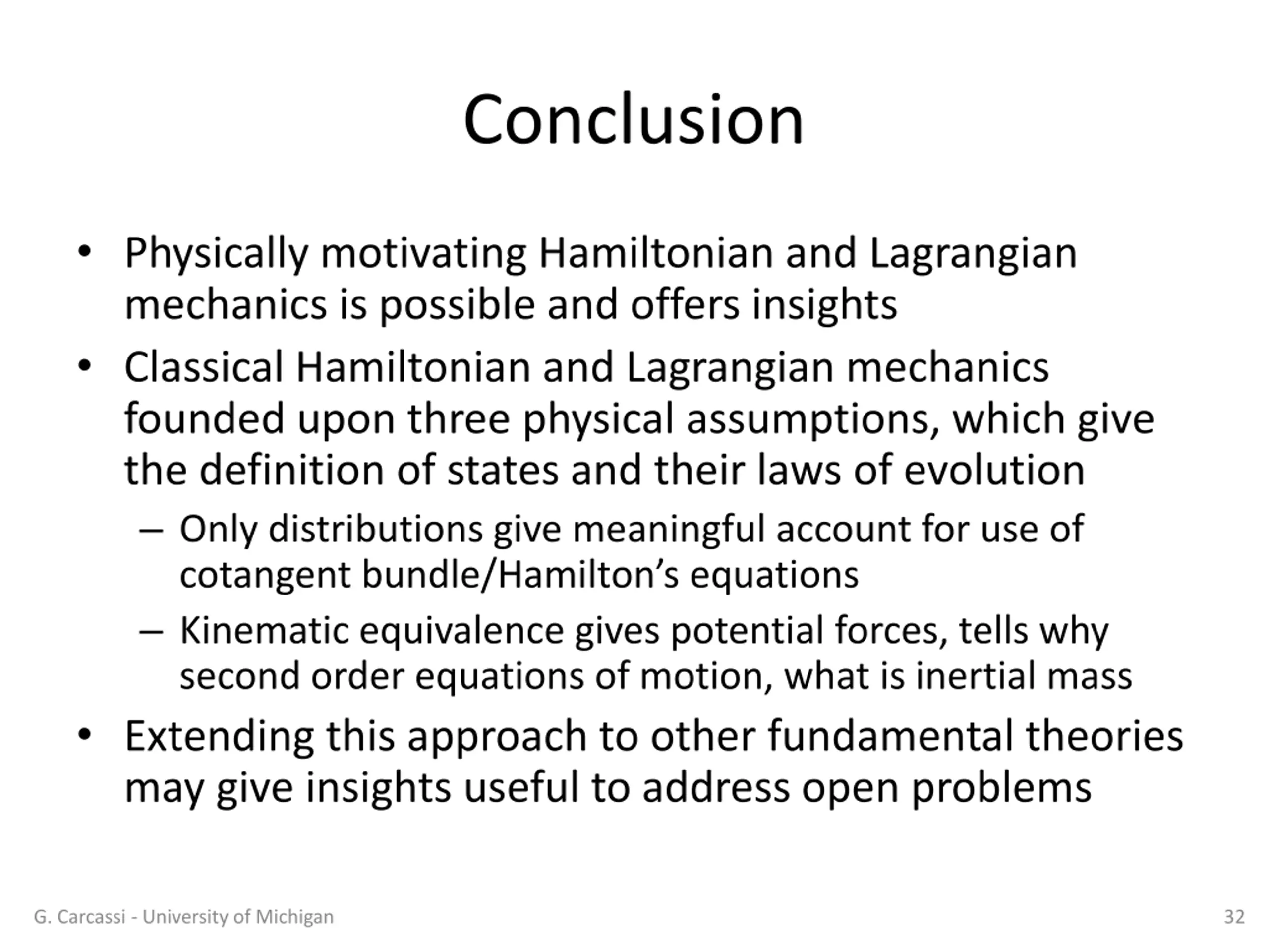 Conclusion Physically motivating Hamiltonian and Lagrangian mechanics is possible and offers insights Classical Hamiltonian and Lagrangian mechanics founded upon three physical assumptions, which give the definition of states and their laws of evolution Only distributions give meaningful account for use of cotangent bundle/Hamilton s equations Kinematic equivalence gives potential forces, tells why second order equations of motion, what is inertial mass Extending this approach to other fundamental theories may give insights useful to address open problems G. Carcassi - University of Michigan 32