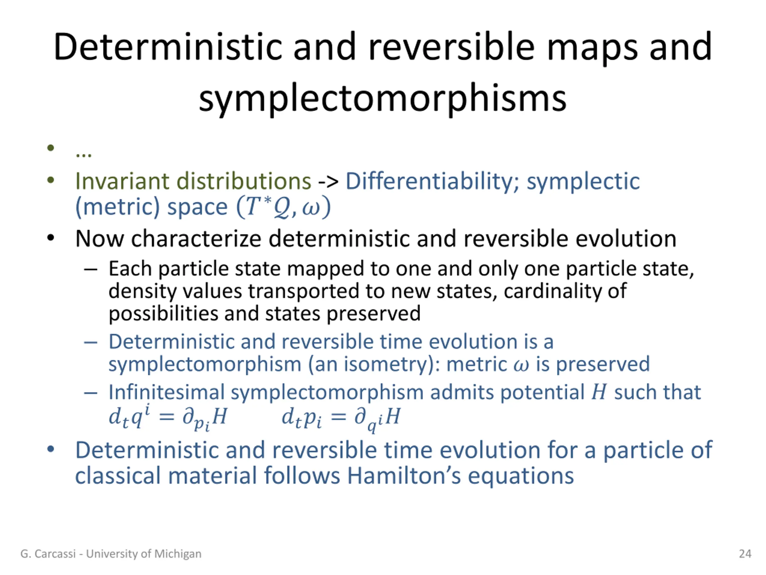 Deterministic and reversible maps and symplectomorphisms Invariant distributions -> Differentiability; symplectic (metric) space ? ?,? Now characterize deterministic and reversible evolution Each particle state mapped to one and only one particle state, density values transported to new states, cardinality of possibilities and states preserved Deterministic and reversible time evolution is a symplectomorphism (an isometry): metric ? is preserved Infinitesimal symplectomorphism admits potential ? such that ????= ???? ????= ???? Deterministic and reversible time evolution for a particle of classical material follows Hamilton s equations G. Carcassi - University of Michigan 24
