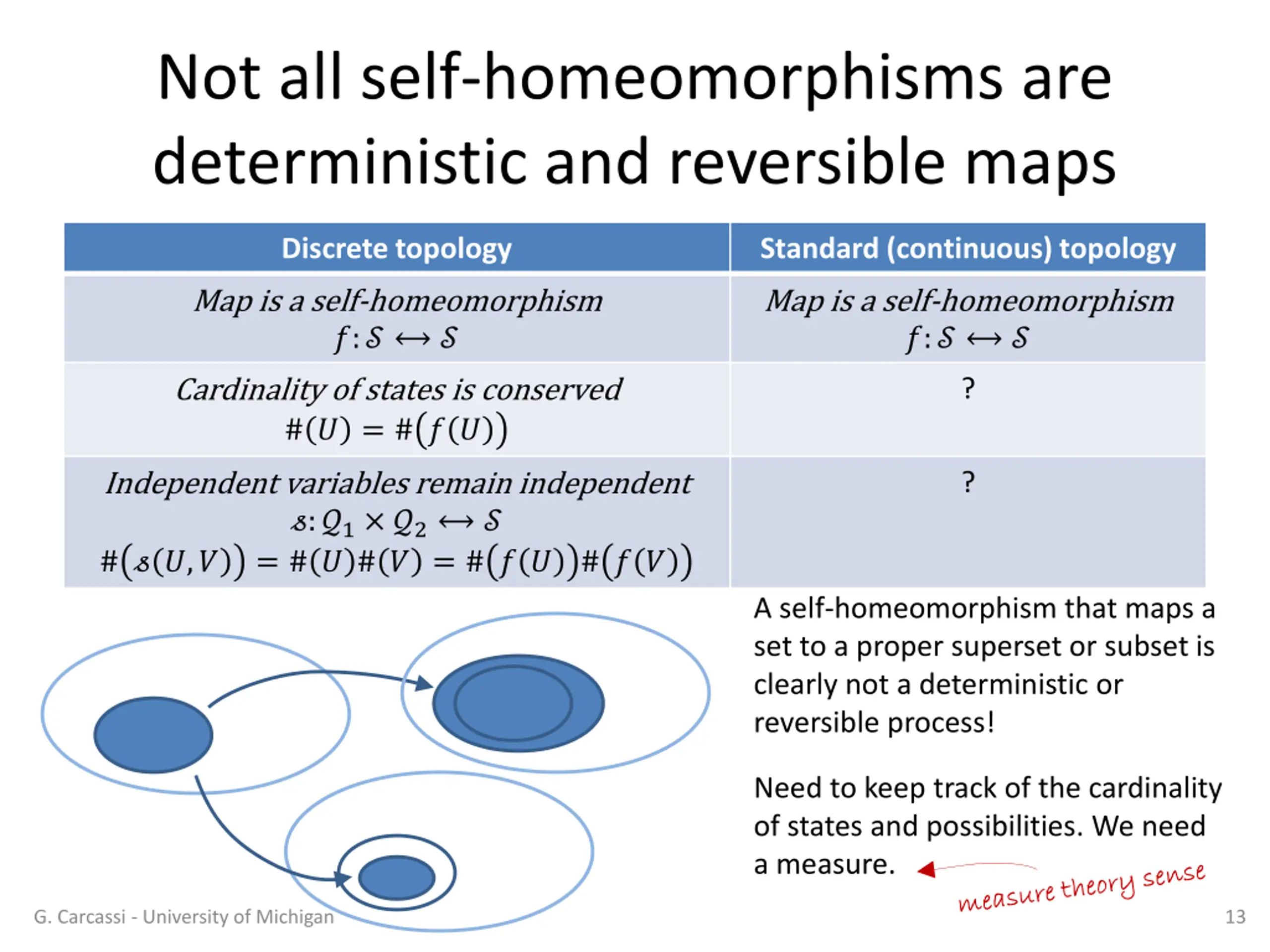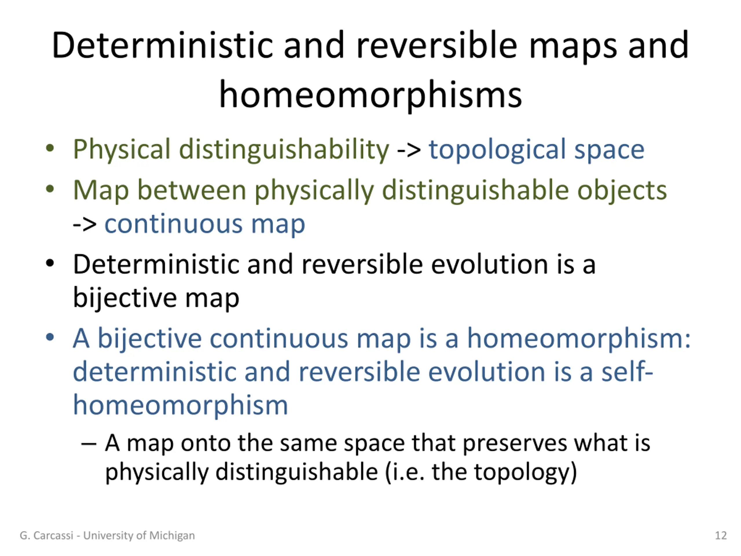 Deterministic and reversible maps and homeomorphisms Physical distinguishability -> topological space Map between physically distinguishable objects -> continuous map Deterministic and reversible evolution is a bijective map A bijective continuous map is a homeomorphism: deterministic and reversible evolution is a self- homeomorphism A map onto the same space that preserves what is physically distinguishable (i.e. the topology) G. Carcassi - University of Michigan 12