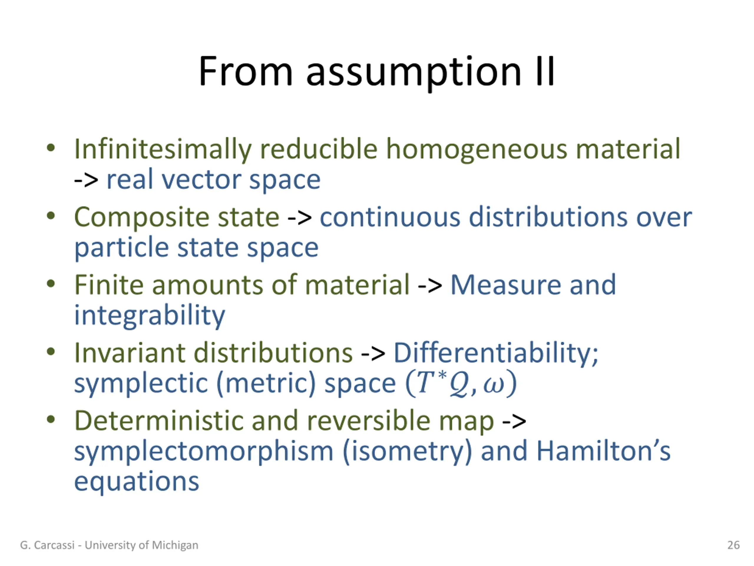 From assumption II Infinitesimally reducible homogeneous material -> real vector space Composite state -> continuous distributions over particle state space Finite amounts of material -> Measure and integrability Invariant distributions -> Differentiability; symplectic (metric) space ? ?,? Deterministic and reversible map -> symplectomorphism (isometry) and Hamilton s equations G. Carcassi - University of Michigan 26