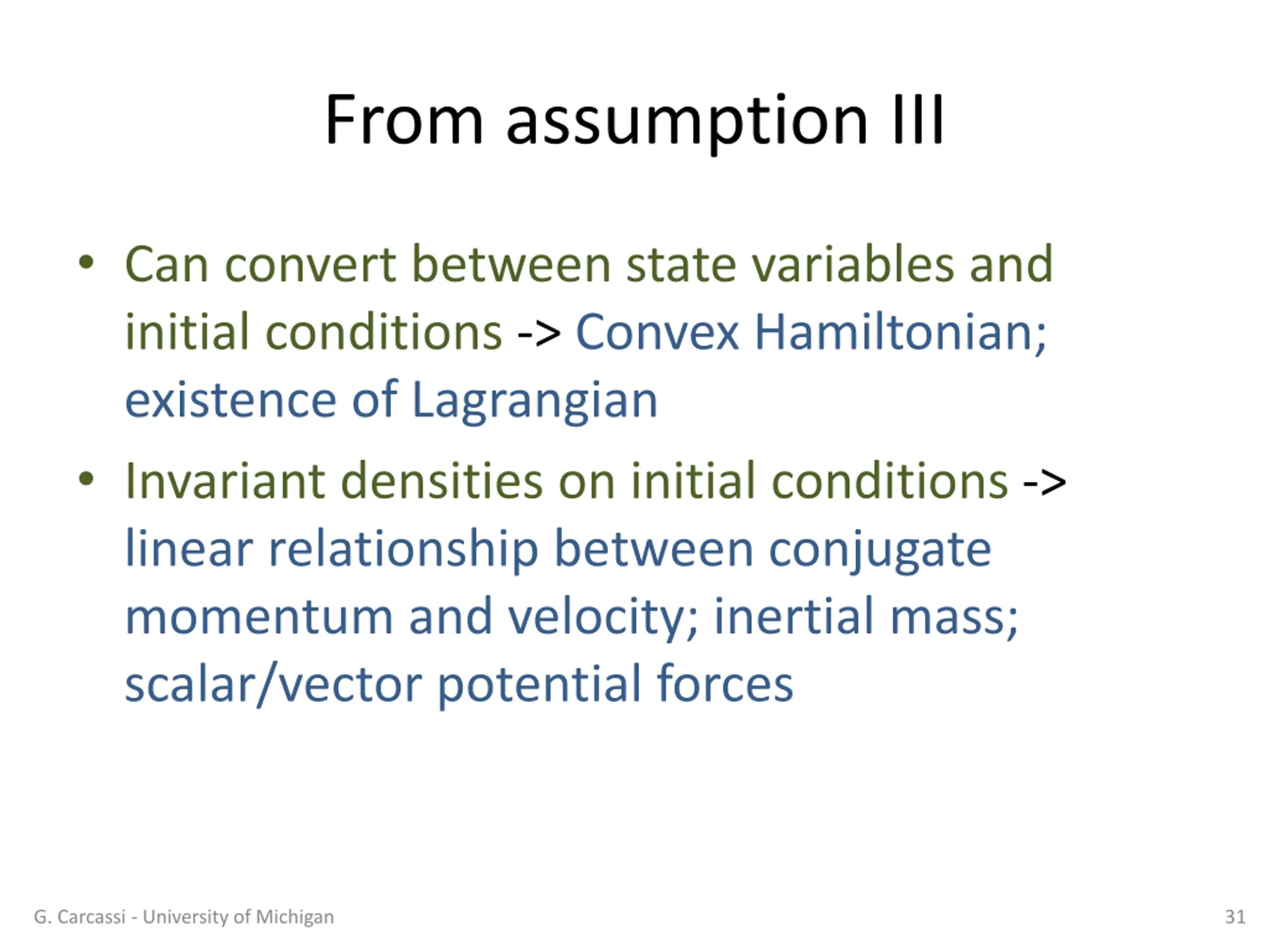 From assumption III Can convert between state variables and initial conditions -> Convex Hamiltonian; existence of Lagrangian Invariant densities on initial conditions -> linear relationship between conjugate momentum and velocity; inertial mass; scalar/vector potential forces G. Carcassi - University of Michigan 31