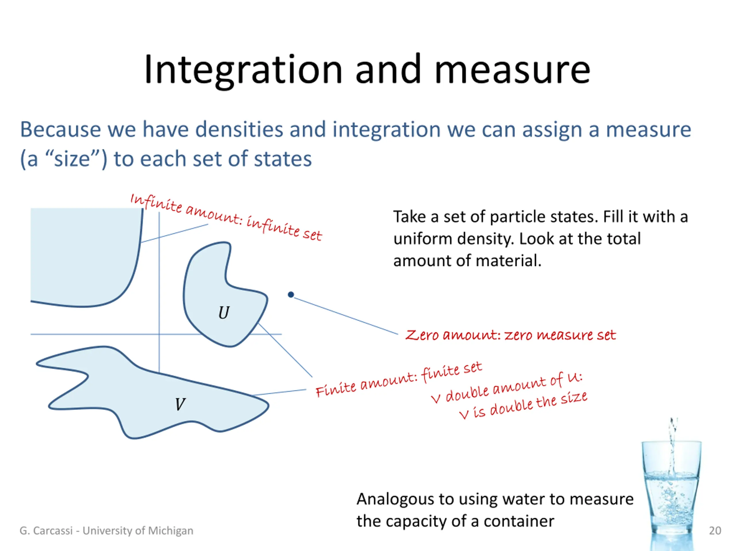 Integration and measure Because we have densities and integration we can assign a measure (a size ) to each set of states Take a set of particle states. Fill it with a uniform density. Look at the total amount of material. ? Zero amount: zero measure set Zero amount: zero measure set ? Analogous to using water to measure the capacity of a container G. Carcassi - University of Michigan 20