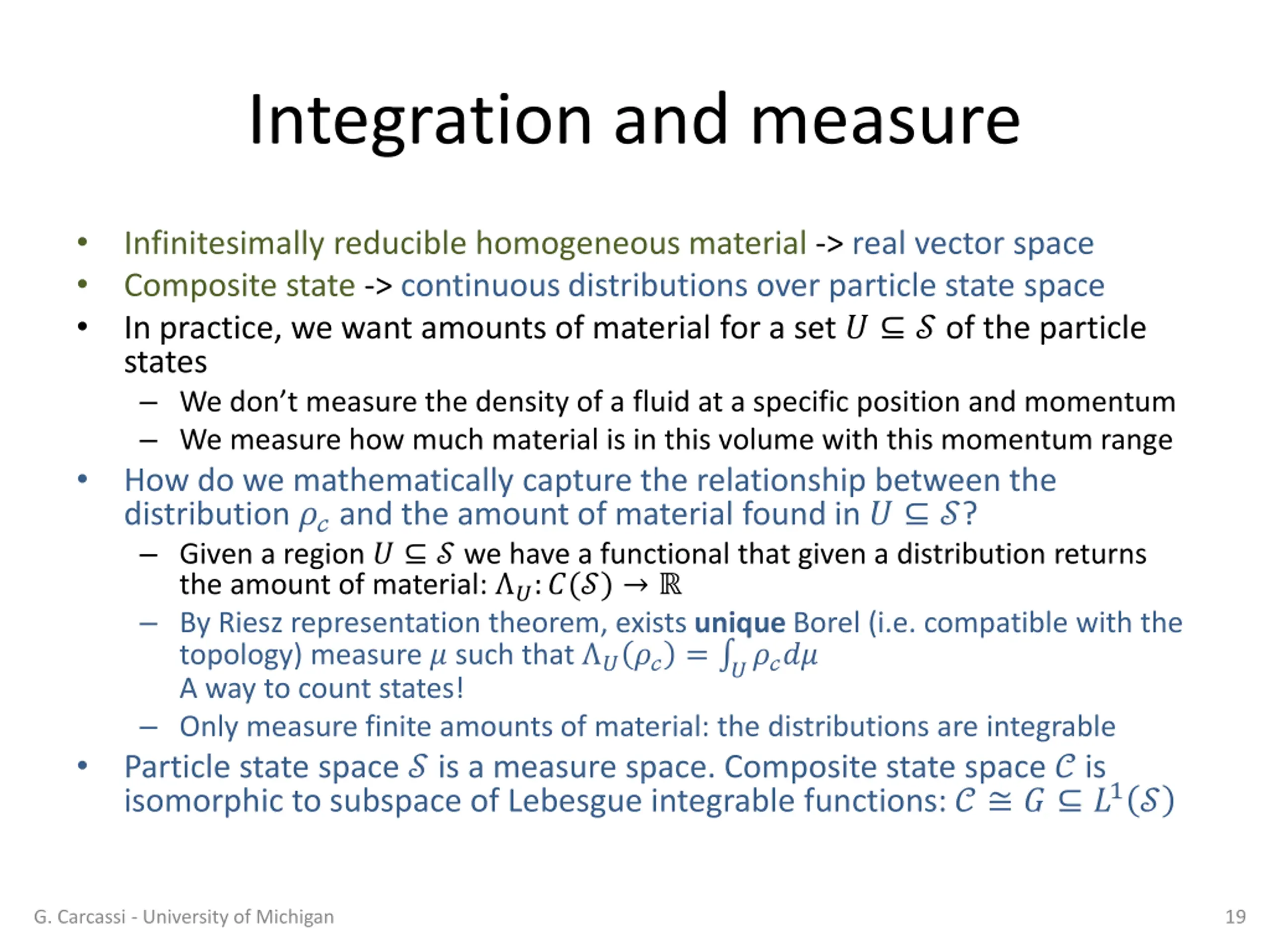 Integration and measure Infinitesimally reducible homogeneous material -> real vector space Composite state -> continuous distributions over particle state space In practice, we want amounts of material for a set ? ? of the particle states We don t measure the density of a fluid at a specific position and momentum We measure how much material is in this volume with this momentum range How do we mathematically capture the relationship between the distribution ??and the amount of material found in ? ?? Given a region ? ? we have a functional that given a distribution returns the amount of material: ?:?(?) By Riesz representation theorem, exists unique Borel (i.e. compatible with the topology) measure ? such that ??? = ????? A way to count states! Only measure finite amounts of material: the distributions are integrable Particle state space ? is a measure space. Composite state space ? is isomorphic to subspace of Lebesgue integrable functions: ? ? ?1? G. Carcassi - University of Michigan 19