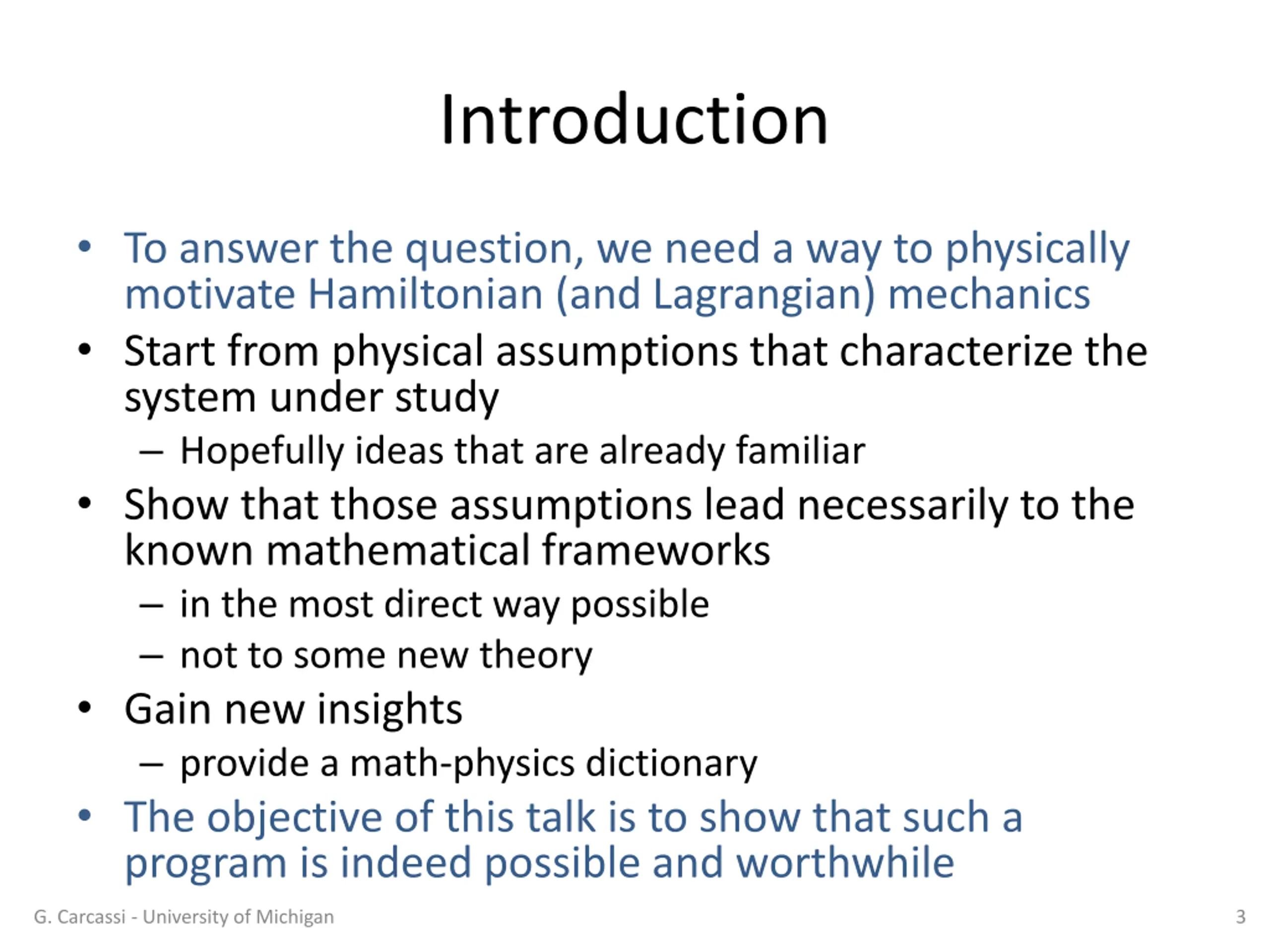 Introduction To answer the question, we need a way to physically motivate Hamiltonian (and Lagrangian) mechanics Start from physical assumptions that characterize the system under study Hopefully ideas that are already familiar Show that those assumptions lead necessarily to the known mathematical frameworks in the most direct way possible not to some new theory Gain new insights provide a math-physics dictionary The objective of this talk is to show that such a program is indeed possible and worthwhile G. Carcassi - University of Michigan 3