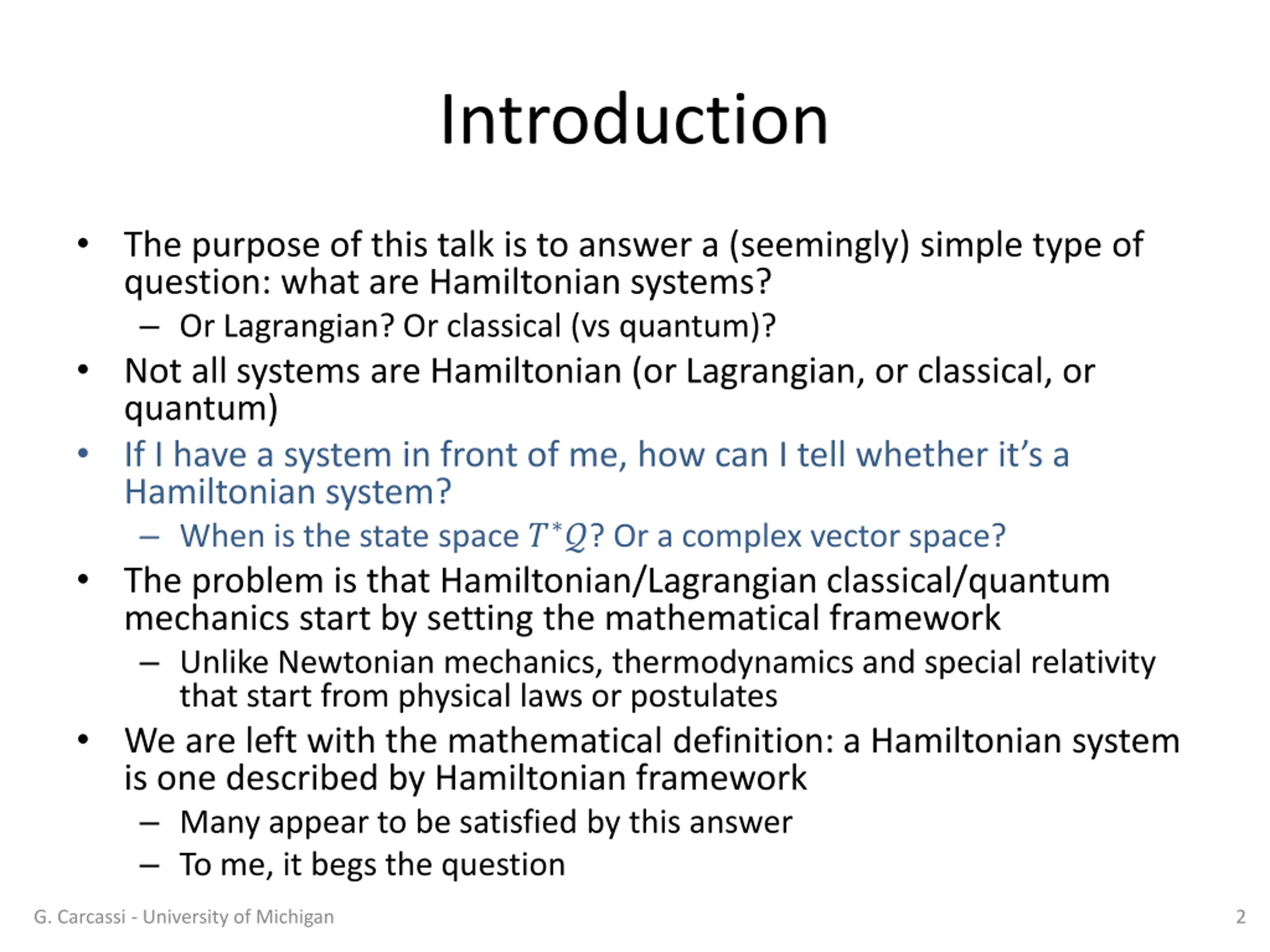 Introduction The purpose of this talk is to answer a (seemingly) simple type of question: what are Hamiltonian systems? Or Lagrangian? Or classical (vs quantum)? Not all systems are Hamiltonian (or Lagrangian, or classical, or quantum) If I have a system in front of me, how can I tell whether it s a Hamiltonian system? When is the state space ? ?? Or a complex vector space? The problem is that Hamiltonian/Lagrangian classical/quantum mechanics start by setting the mathematical framework Unlike Newtonian mechanics, thermodynamics and special relativity that start from physical laws or postulates We are left with the mathematical definition: a Hamiltonian system is one described by Hamiltonian framework Many appear to be satisfied by this answer To me, it begs the question G. Carcassi - University of Michigan 2