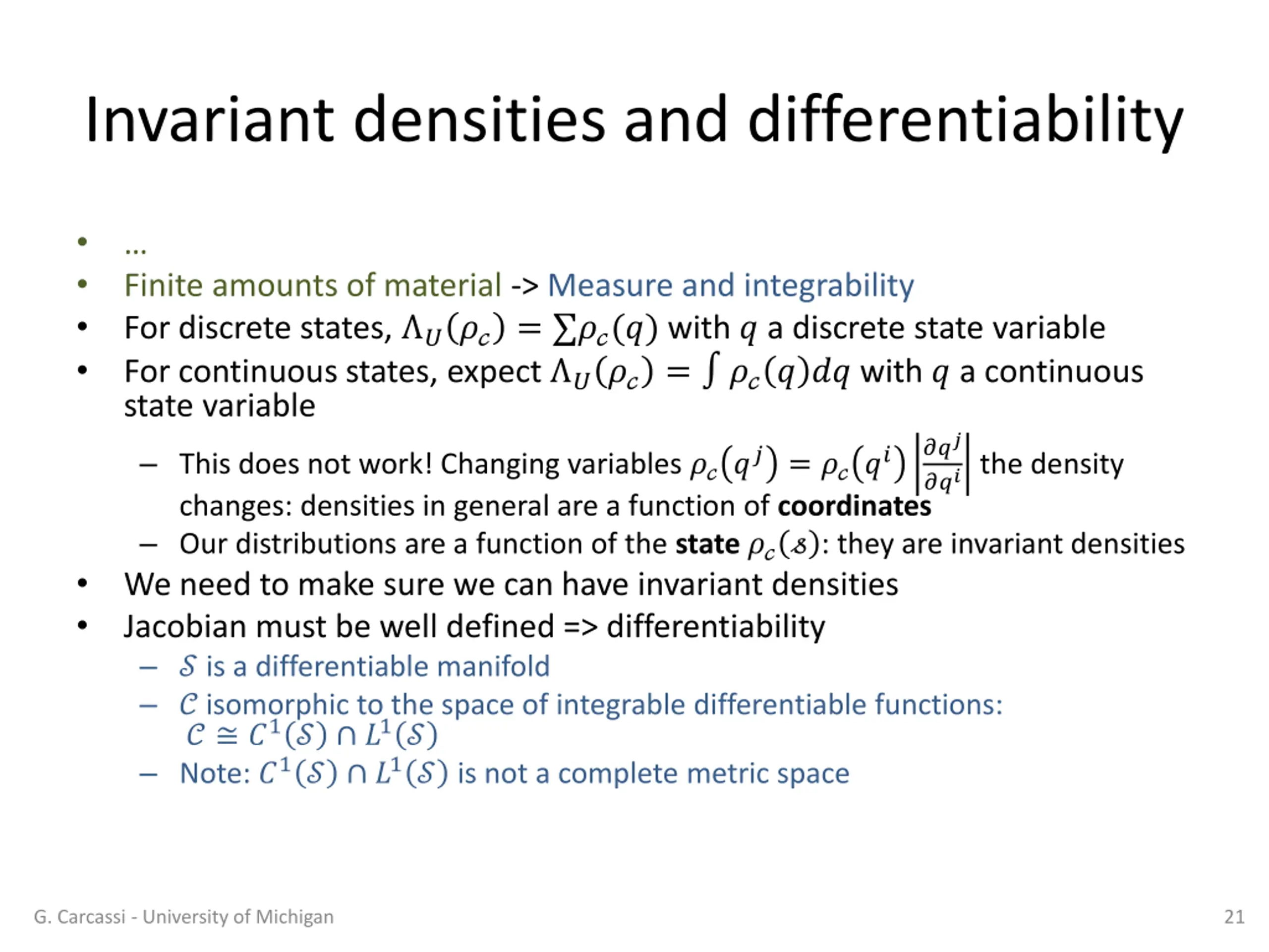 Invariant densities and differentiability Finite amounts of material -> Measure and integrability For discrete states, ??? = ??(?) with ? a discrete state variable For continuous states, expect ??? = ??? ?? with ? a continuous state variable ??? ??? the density This does not work! Changing variables ????= ???? changes: densities in general are a function of coordinates Our distributions are a function of the state??? : they are invariant densities We need to make sure we can have invariant densities Jacobian must be well defined => differentiability ? is a differentiable manifold ? isomorphic to the space of integrable differentiable functions: ? ?1? ?1? Note: ?1? ?1? is not a complete metric space G. Carcassi - University of Michigan 21