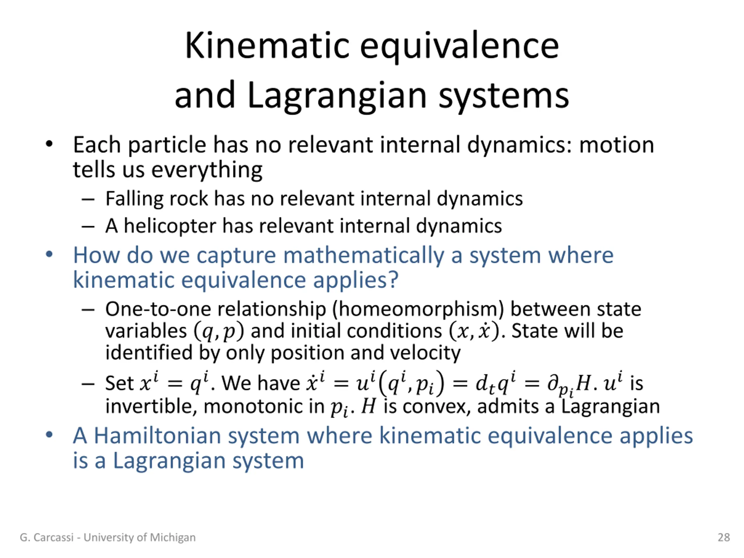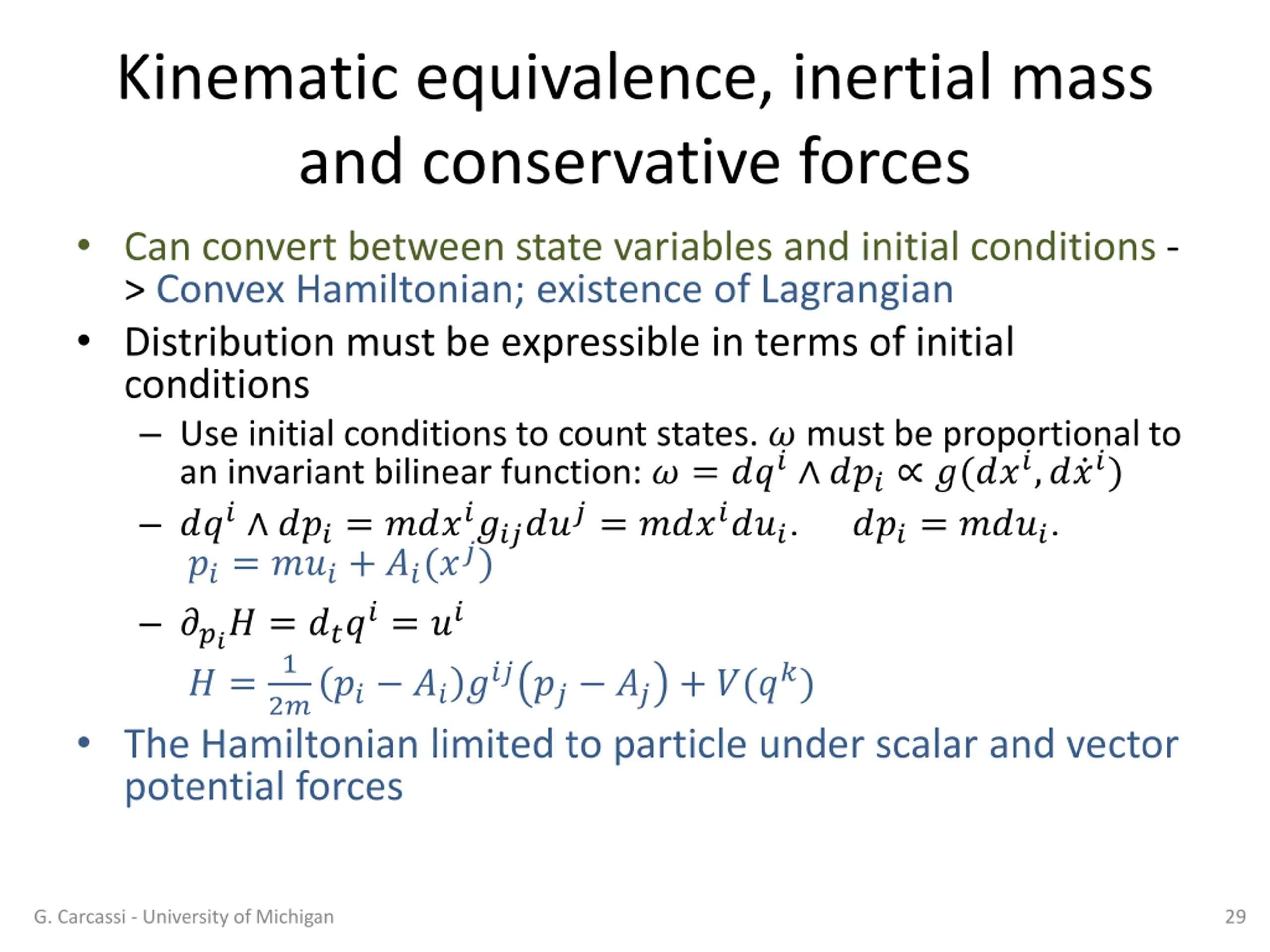 Kinematic equivalence and Lagrangian systems Each particle has no relevant internal dynamics: motion tells us everything Falling rock has no relevant internal dynamics A helicopter has relevant internal dynamics How do we capture mathematically a system where kinematic equivalence applies? One-to-one relationship (homeomorphism) between state variables ?,? and initial conditions ?, ? . State will be identified by only position and velocity Set ??= ??. We have ??= ????,?? = ????= ????. ?? is invertible, monotonic in ??. ? is convex, admits a Lagrangian A Hamiltonian system where kinematic equivalence applies is a Lagrangian system G. Carcassi - University of Michigan 28