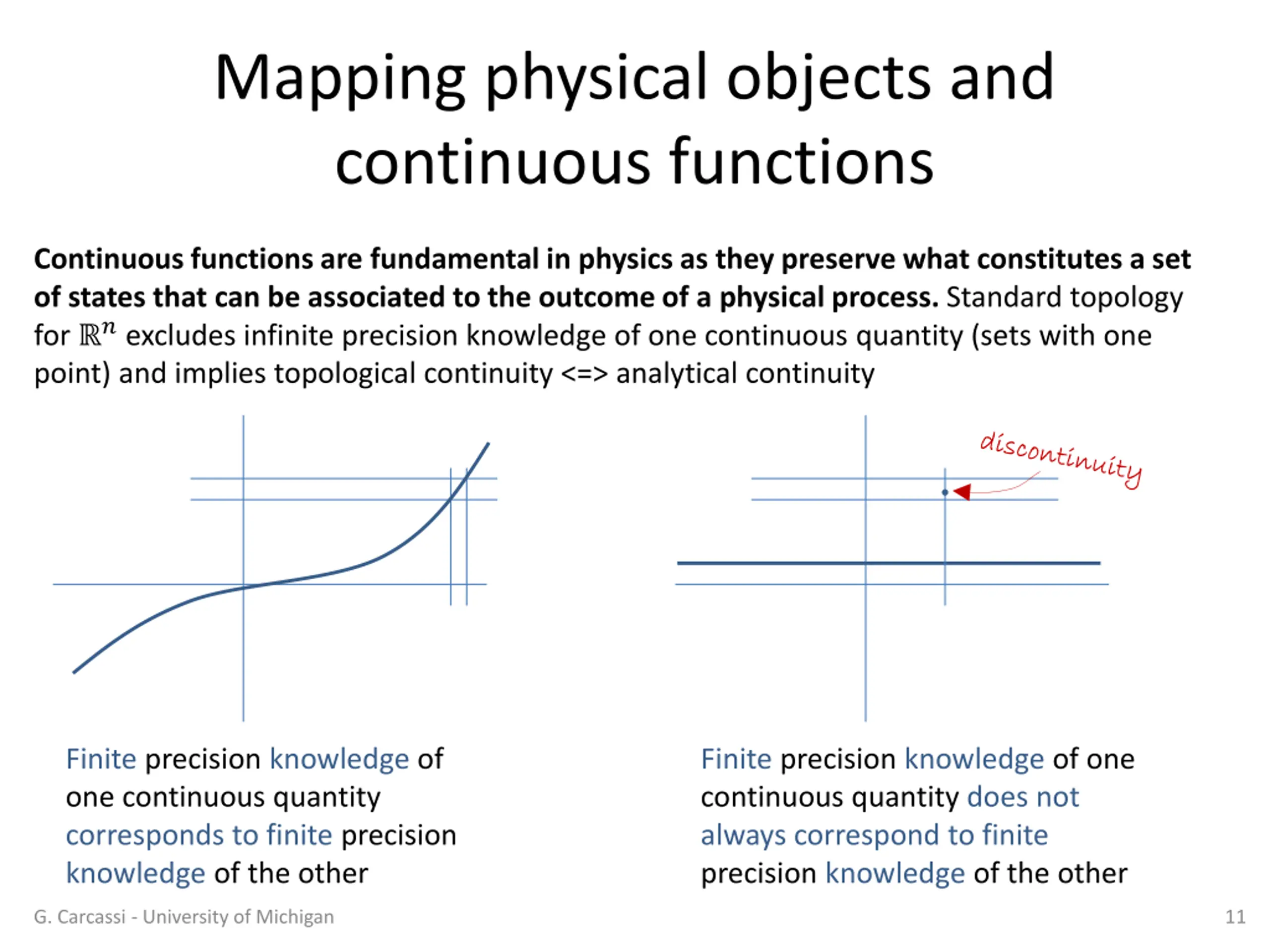 Mapping physical objects and continuous functions Physical distinguishability -> topological space We now want to associate initial and final states through the evolution map The map has to be compatible with physical distinguishability: distinguishing final (or initial) states is also distinguishing initial (or final states) How do we mathematically capture maps between physically distinguishable objects? If ? is a distinguishable set of final states, then ? 1(?) is a distinguishable set of initial states: ? 1(?) is in the topology A map between distinguishable objects is a continuous map by definition G. Carcassi - University of Michigan 10