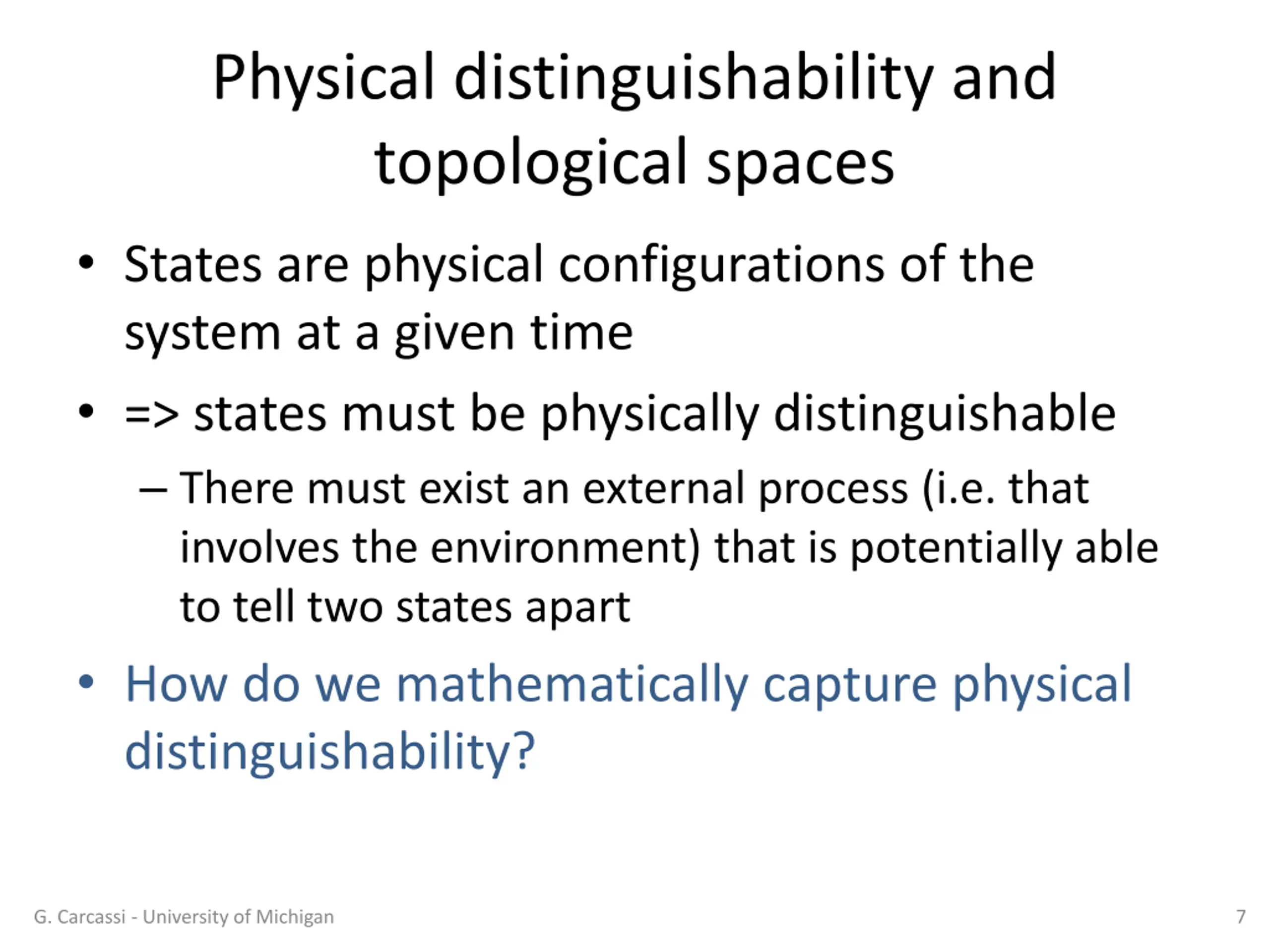 Physical distinguishability and topological spaces States are physical configurations of the system at a given time => states must be physically distinguishable There must exist an external process (i.e. that involves the environment) that is potentially able to tell two states apart How do we mathematically capture physical distinguishability? G. Carcassi - University of Michigan 7
