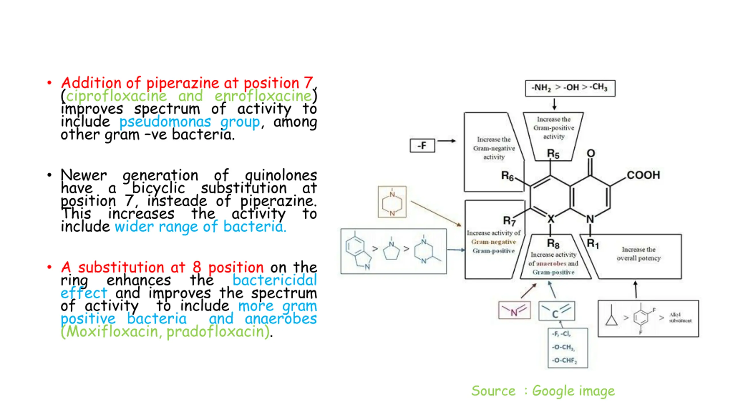 Addition of piperazine at position 7, (ciprofloxacine and enrofloxacine) improves spectrum of activity to include pseudomonas group, among other gram ve bacteria. Newer generation of quinolones have a bicyclic substitution at position 7, insteade of piperazine. This increases the activity to include wider range of bacteria. A substitution at 8 position on the ring enhances the effect and improves the spectrum of activity to include more gram positive bacteria and anaerobes (Moxifloxacin, pradofloxacin). bactericidal Source : Google image
