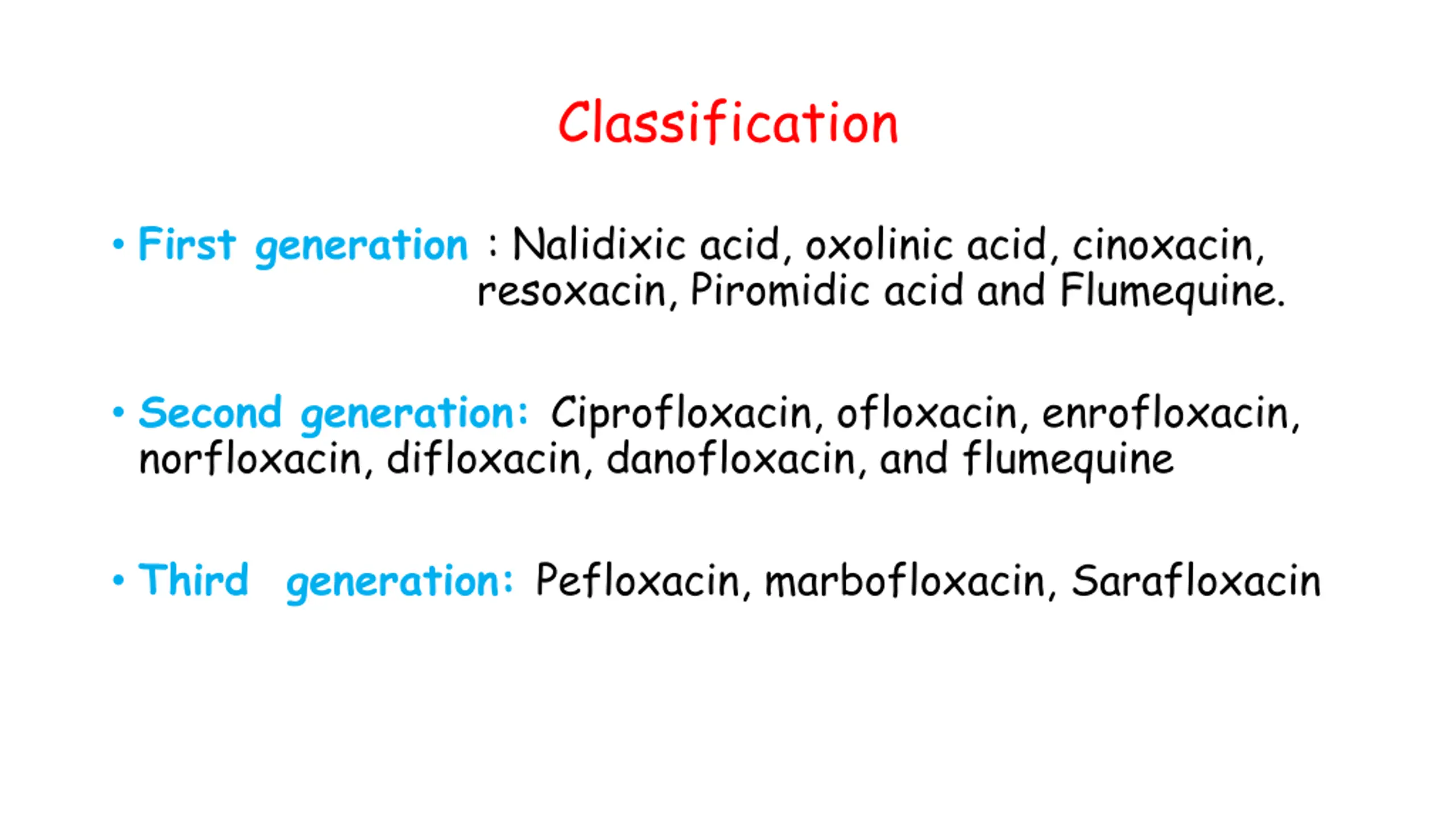 Classification First generation : Nalidixic acid, oxolinic acid, cinoxacin, resoxacin, Piromidic acid and Flumequine. Second generation: Ciprofloxacin, ofloxacin, enrofloxacin, norfloxacin, difloxacin, danofloxacin, and flumequine Third generation: Pefloxacin, marbofloxacin, Sarafloxacin