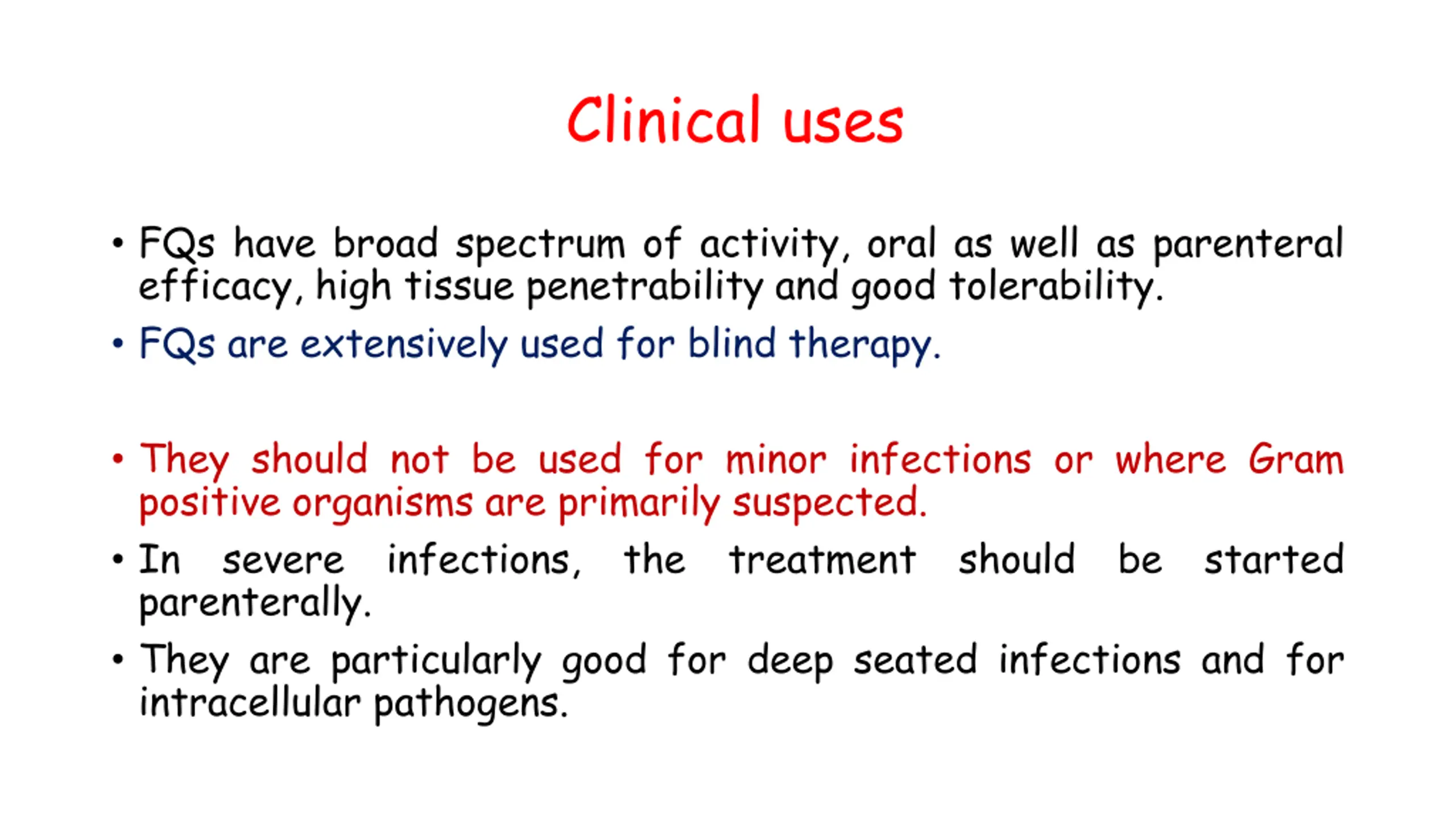 Clinical uses FQs have broad spectrum of activity, oral as well as parenteral efficacy, high tissue penetrability and good tolerability. FQs are extensively used for blind therapy. They should not be used for minor infections or where Gram positive organisms are primarily suspected. In severe infections, the treatment should be started parenterally. They are particularly good for deep seated infections and for intracellular pathogens.