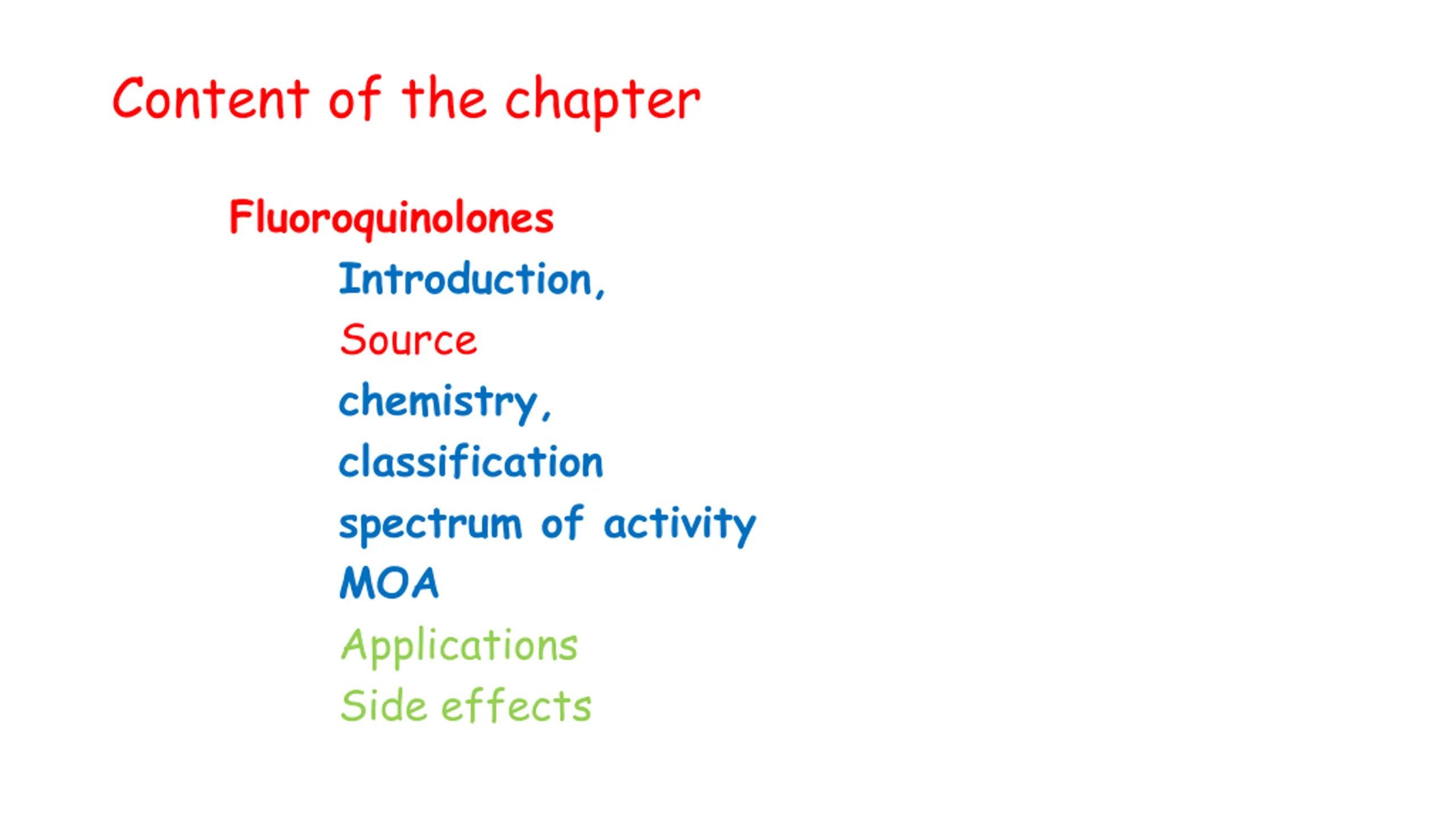Content of the chapter Fluoroquinolones Introduction, Source chemistry, classification spectrum of activity MOA Applications Side effects