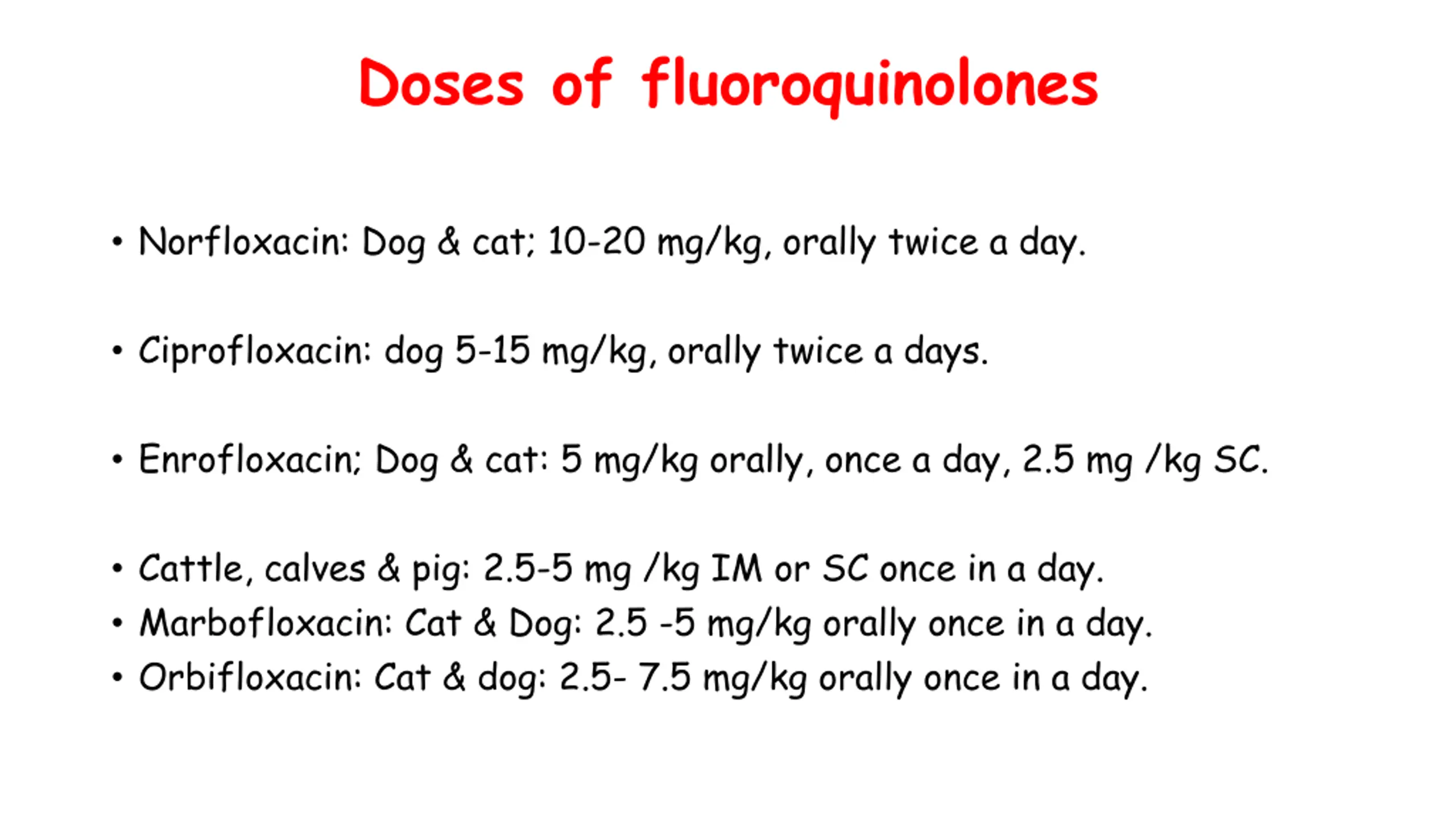 Doses of fluoroquinolones Norfloxacin: Dog & cat; 10-20 mg/kg, orally twice a day. Ciprofloxacin: dog 5-15 mg/kg, orally twice a days. Enrofloxacin; Dog & cat: 5 mg/kg orally, once a day, 2.5 mg /kg SC. Cattle, calves & pig: 2.5-5 mg /kg IM or SC once in a day. Marbofloxacin: Cat & Dog: 2.5 -5 mg/kg orally once in a day. Orbifloxacin: Cat & dog: 2.5- 7.5 mg/kg orally once in a day.