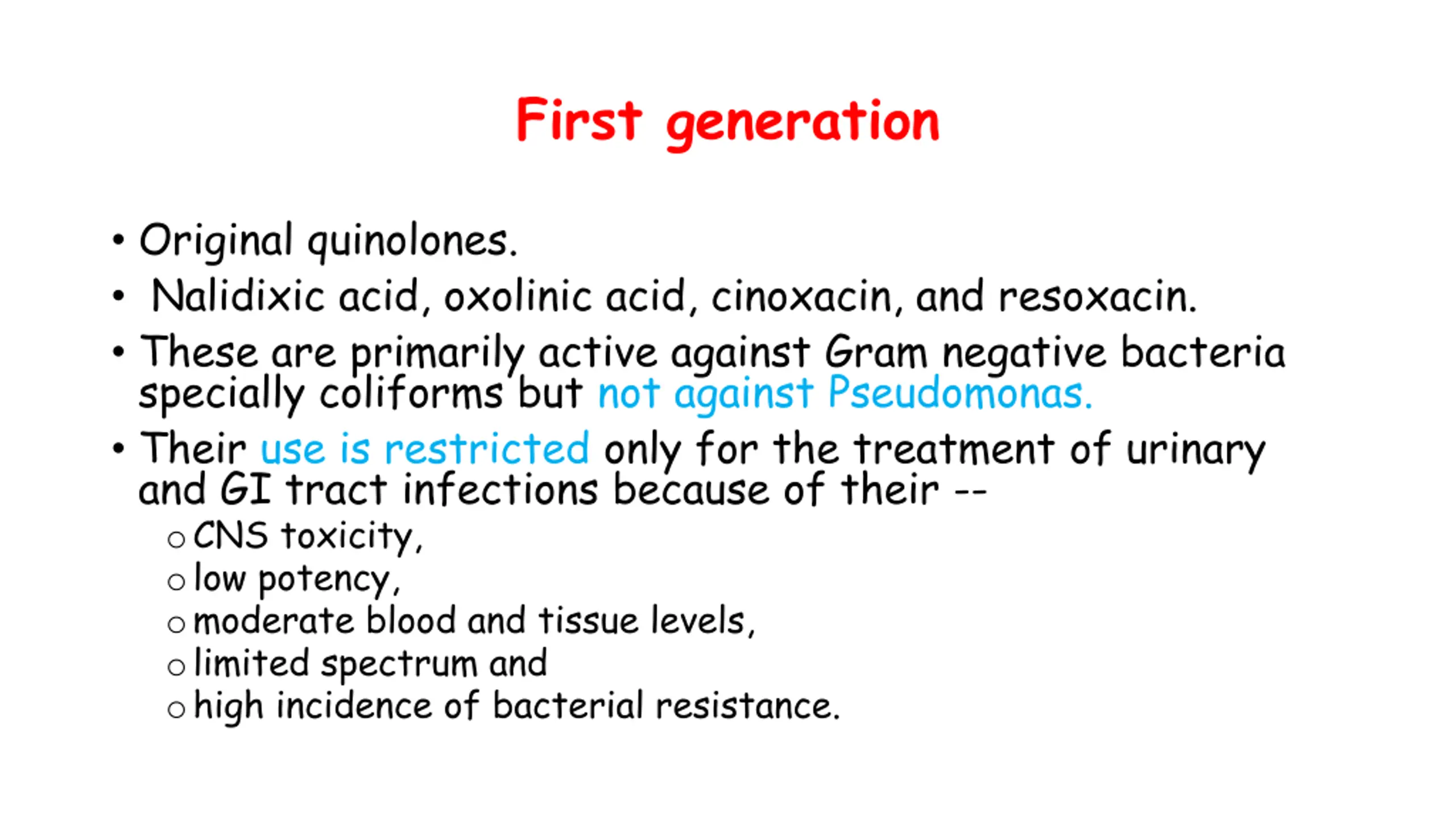 First generation Original quinolones. Nalidixic acid, oxolinic acid, cinoxacin, and resoxacin. These are primarily active against Gram negative bacteria specially coliforms but not against Pseudomonas. Their use is restricted only for the treatment of urinary and GI tract infections because of their -- oCNS toxicity, olow potency, omoderate blood and tissue levels, olimited spectrum and ohigh incidence of bacterial resistance.