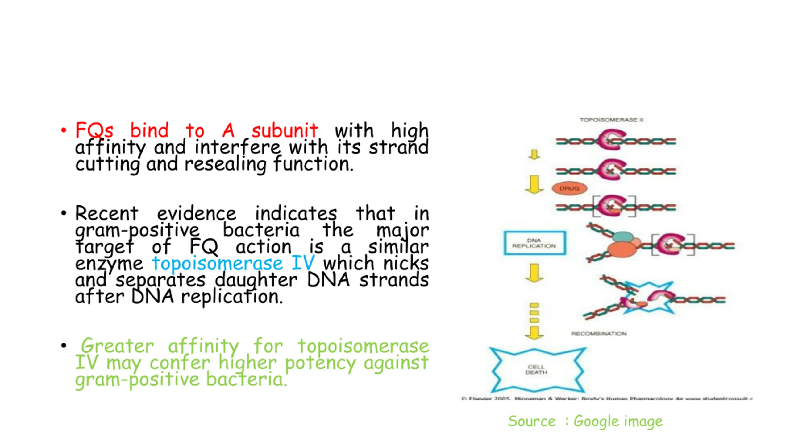 FQs bind to A subunit with high affinity and interfere with its strand cutting and resealing function. Recent evidence indicates that in gram-positive bacteria the major target of FQ action is a similar enzyme topoisomerase IV which nicks and separates daughter DNA strands after DNA replication. Greater affinity for topoisomerase IV may confer higher potency against gram-positive bacteria. Source : Google image