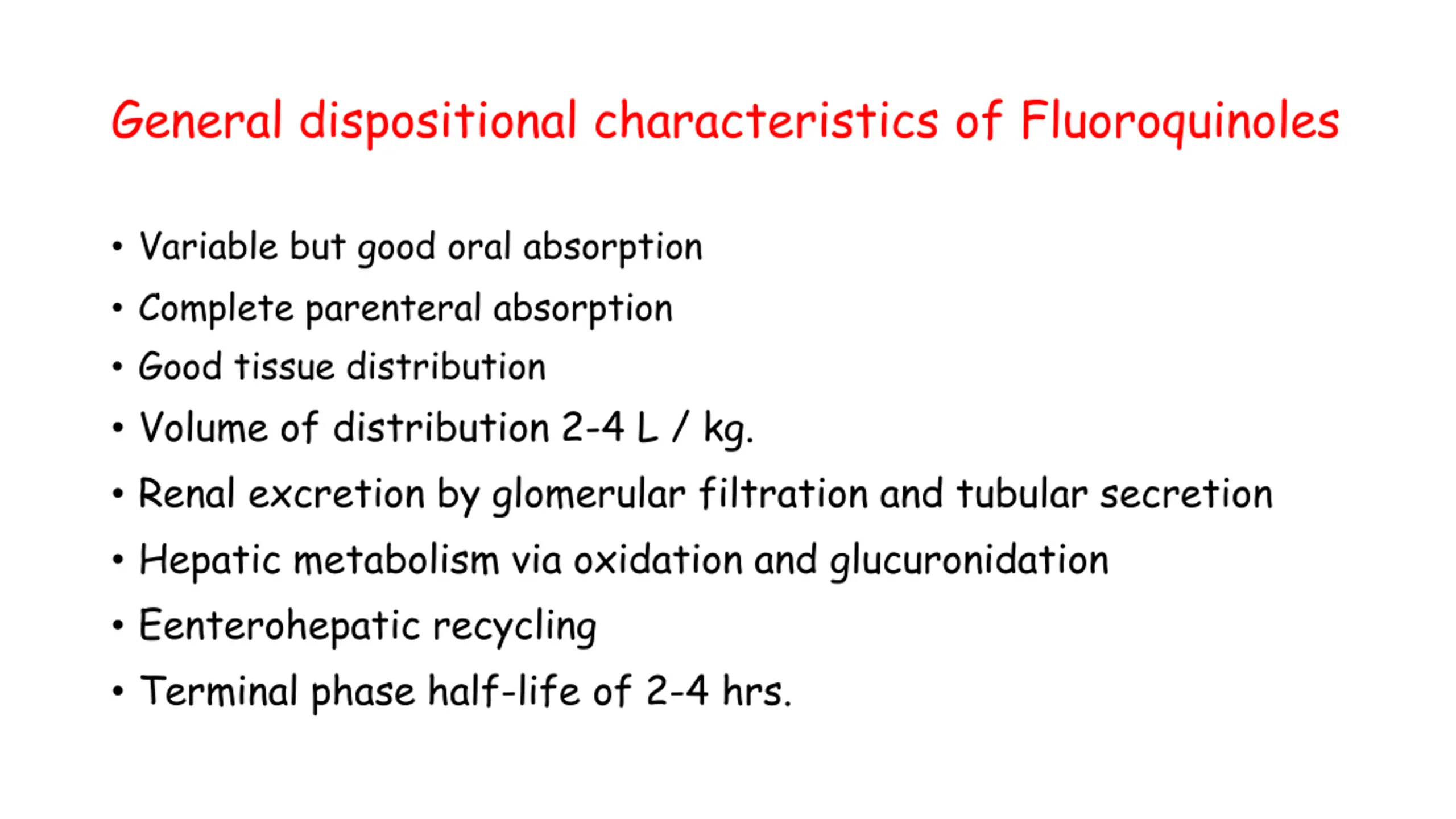 General dispositional characteristics of Fluoroquinoles Variable but good oral absorption Complete parenteral absorption Good tissue distribution Volume of distribution 2-4 L / kg. Renal excretion by glomerular filtration and tubular secretion Hepatic metabolism via oxidation and glucuronidation Eenterohepatic recycling Terminal phase half-life of 2-4 hrs.