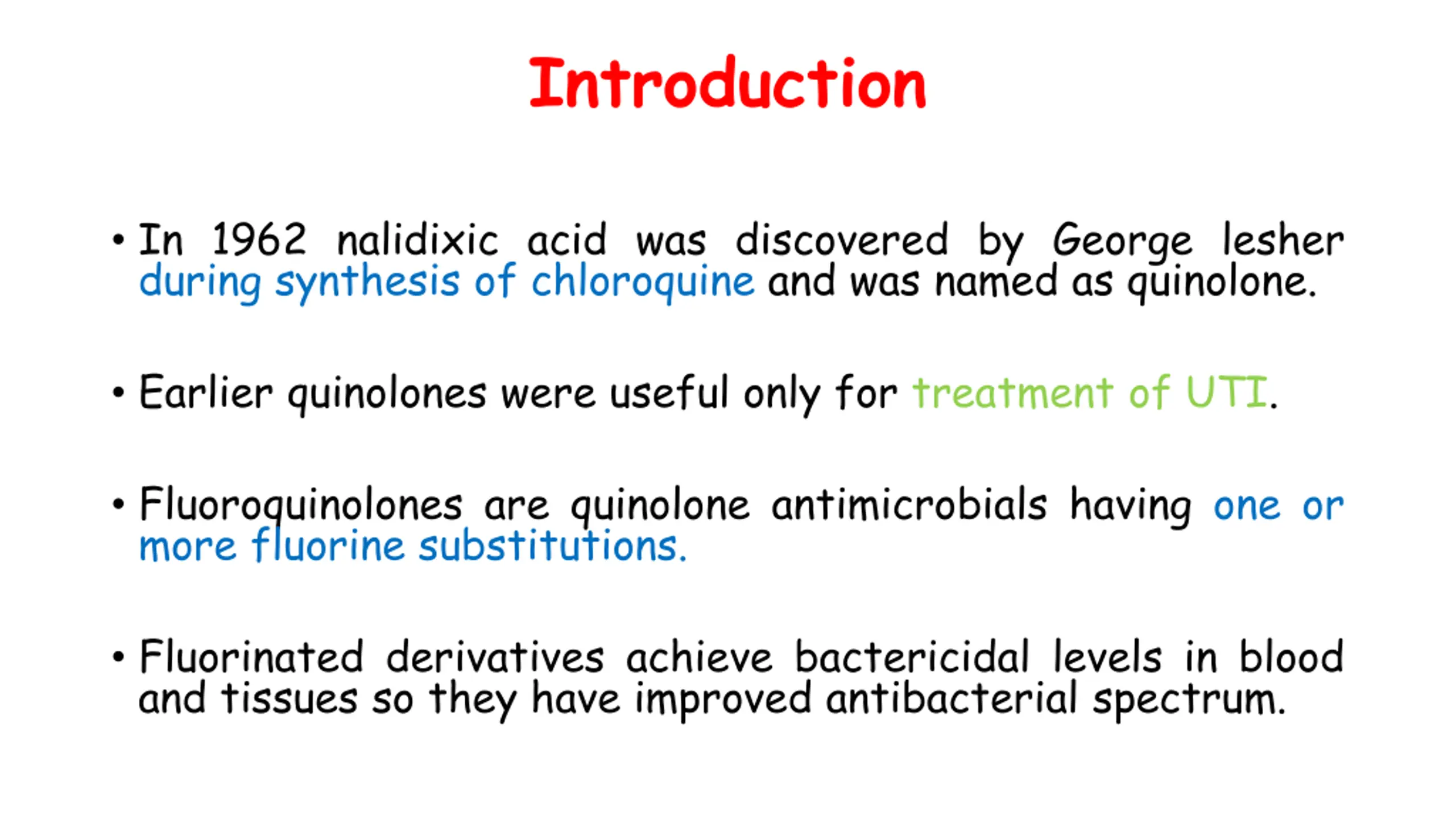 Introduction In 1962 nalidixic acid was discovered by George lesher during synthesis of chloroquine and was named as quinolone. Earlier quinolones were useful only for treatment of UTI. Fluoroquinolones are quinolone antimicrobials having one or more fluorine substitutions. Fluorinated derivatives achieve bactericidal levels in blood and tissues so they have improved antibacterial spectrum.