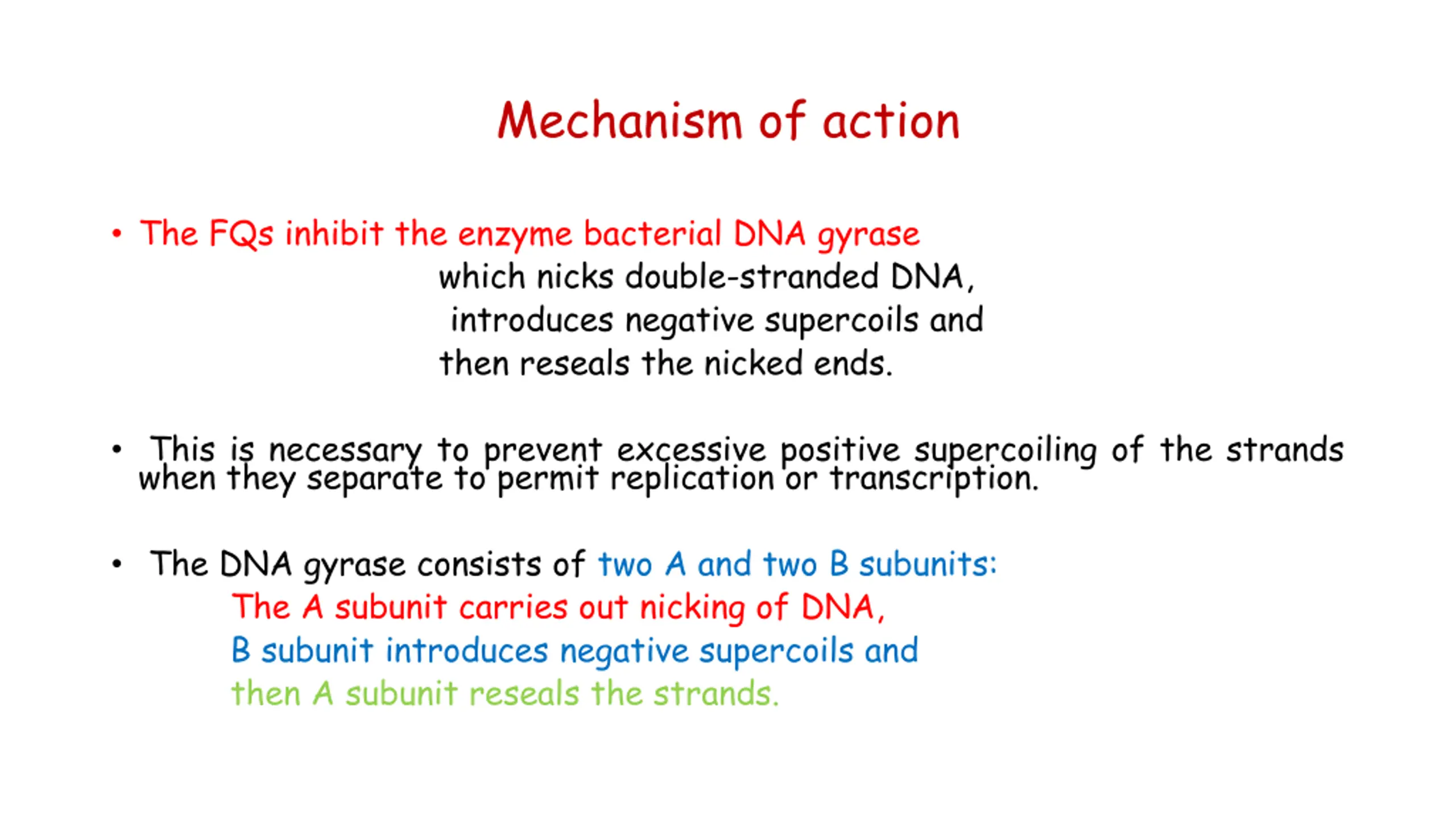 Mechanism of action The FQs inhibit the enzyme bacterial DNA gyrase which nicks double-stranded DNA, introduces negative supercoils and then reseals the nicked ends. This is necessary to prevent excessive positive supercoiling of the strands when they separate to permit replication or transcription. The DNA gyrase consists of two A and two B subunits: The A subunit carries out nicking of DNA, B subunit introduces negative supercoils and then A subunit reseals the strands.