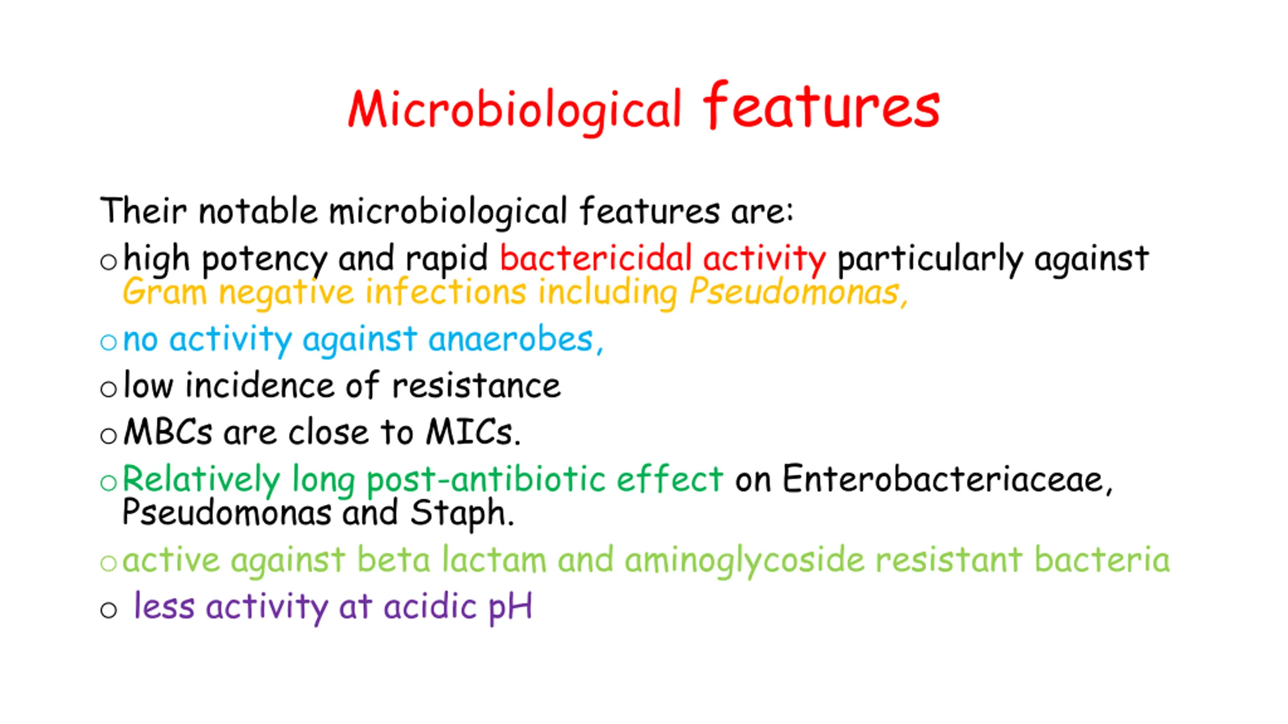 Microbiological features Their notable microbiological features are: ohigh potency and rapid bactericidal activity particularly against Gram negative infections including Pseudomonas, ono activity against anaerobes, olow incidence of resistance oMBCs are close to MICs. oRelatively long post-antibiotic effect on Enterobacteriaceae, Pseudomonas and Staph. oactive against beta lactam and aminoglycoside resistant bacteria o less activity at acidic pH