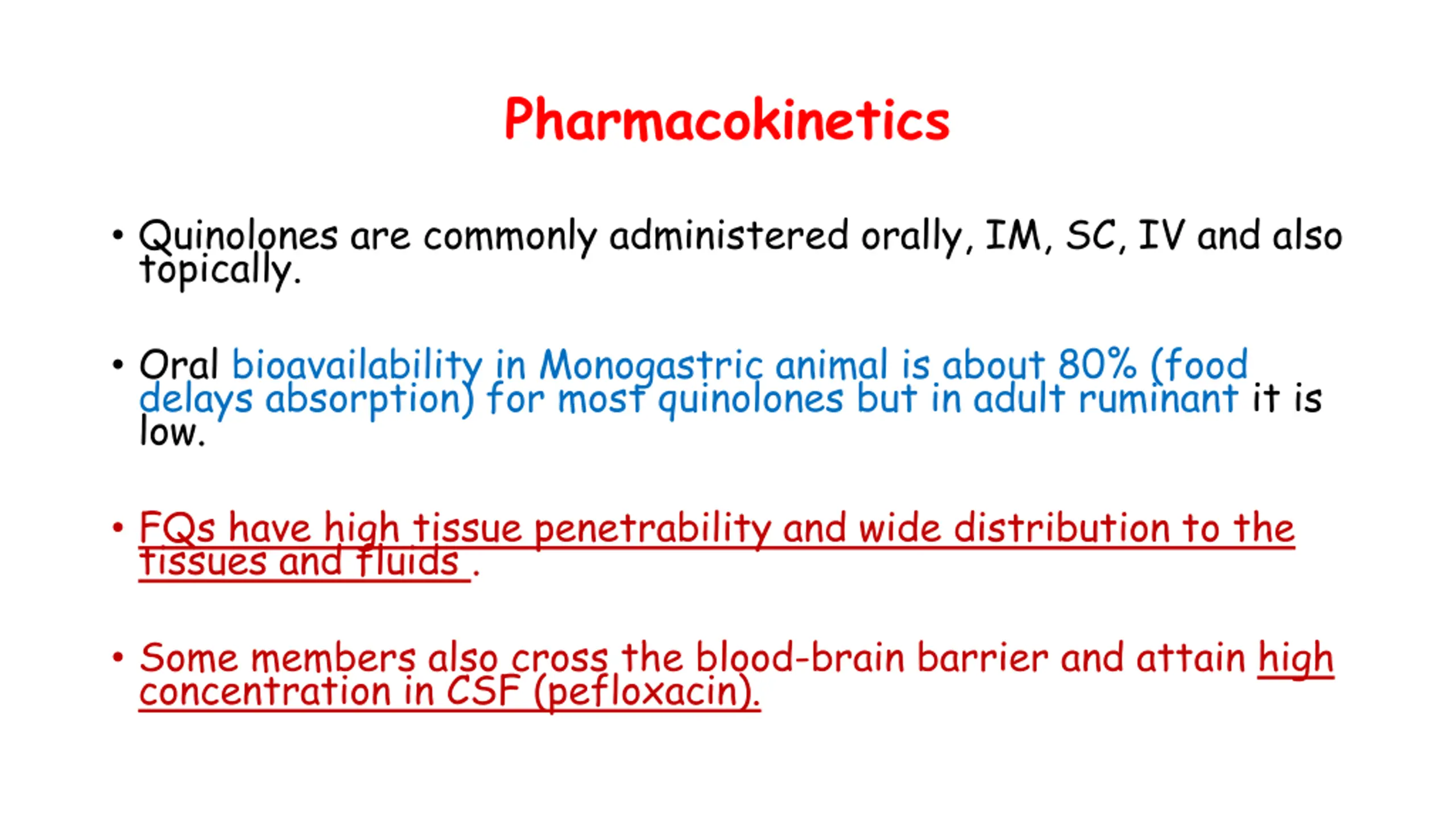 Pharmacokinetics Quinolones are commonly administered orally, IM, SC, IV and also topically. Oral bioavailability in Monogastric animal is about 80% (food delays absorption) for most quinolones but in adult ruminant it is low. FQs have high tissue penetrability and wide distribution to the tissues and fluids . Some members also cross the blood-brain barrier and attain high concentration in CSF (pefloxacin).