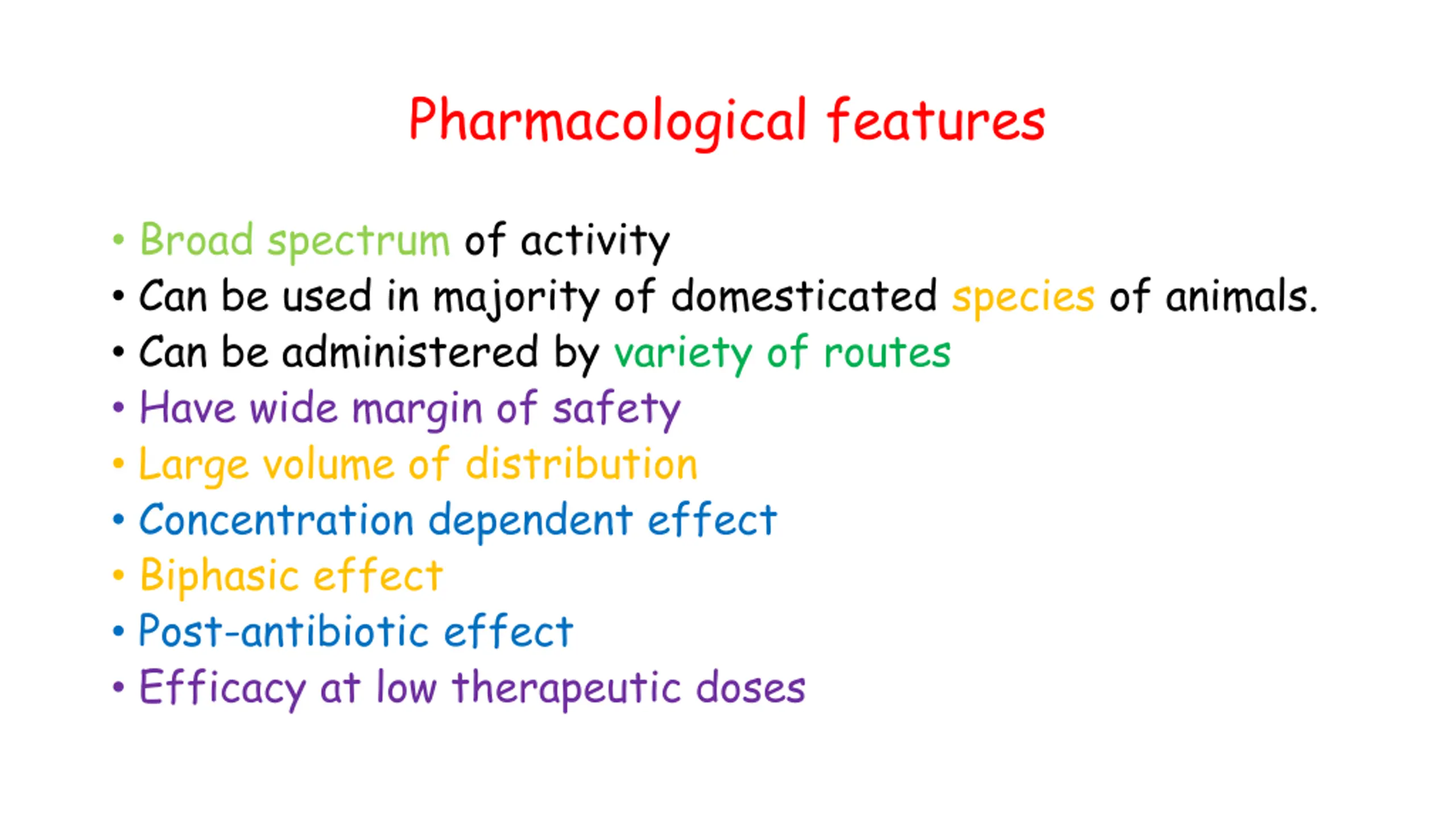 Pharmacological features Broad spectrum of activity Can be used in majority of domesticated species of animals. Can be administered by variety of routes Have wide margin of safety Large volume of distribution Concentration dependent effect Biphasic effect Post-antibiotic effect Efficacy at low therapeutic doses