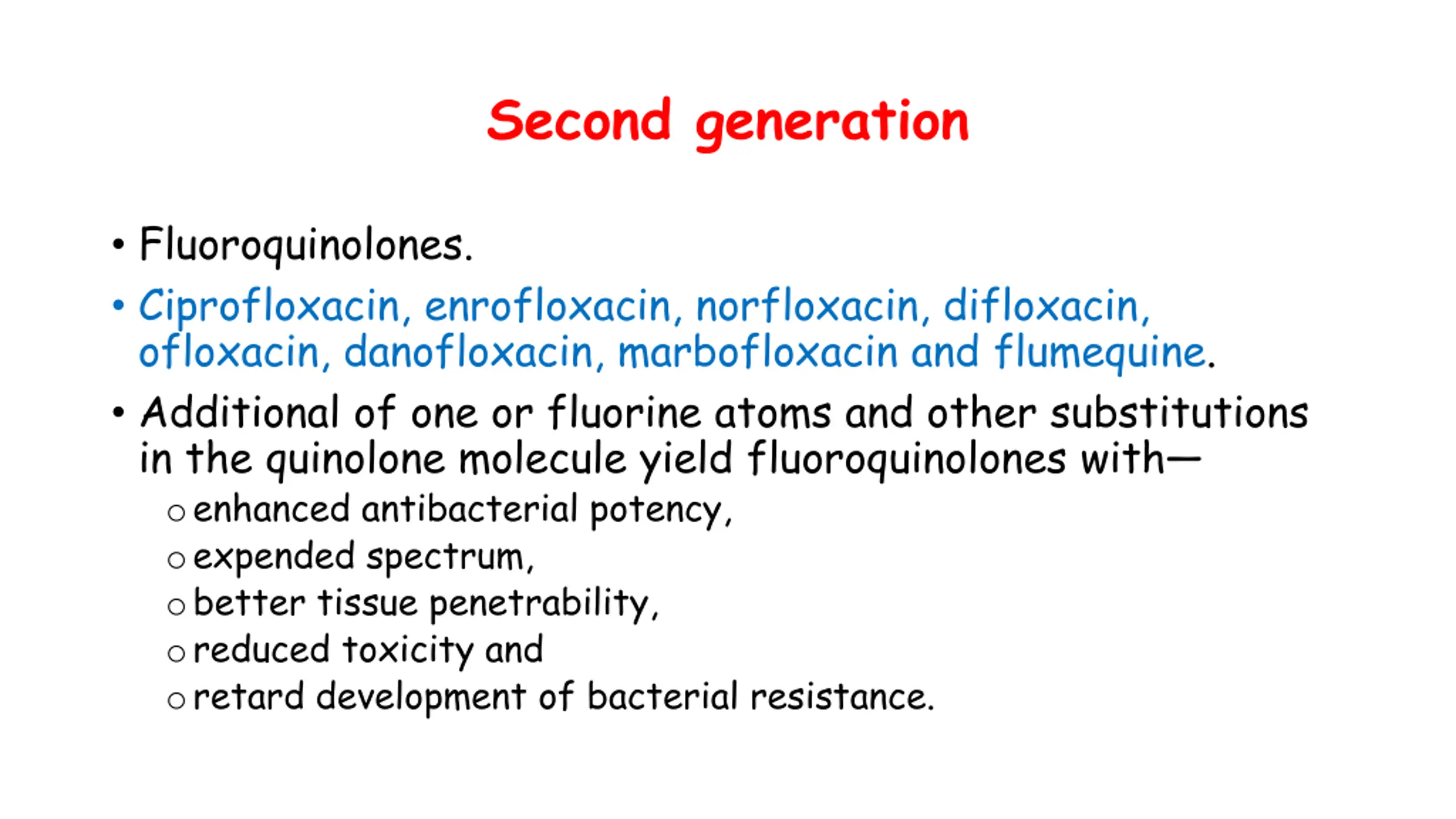 Second generation Fluoroquinolones. Ciprofloxacin, enrofloxacin, norfloxacin, difloxacin, ofloxacin, danofloxacin, marbofloxacin and flumequine. Additional of one or fluorine atoms and other substitutions in the quinolone molecule yield fluoroquinolones with oenhanced antibacterial potency, oexpended spectrum, obetter tissue penetrability, oreduced toxicity and oretard development of bacterial resistance.