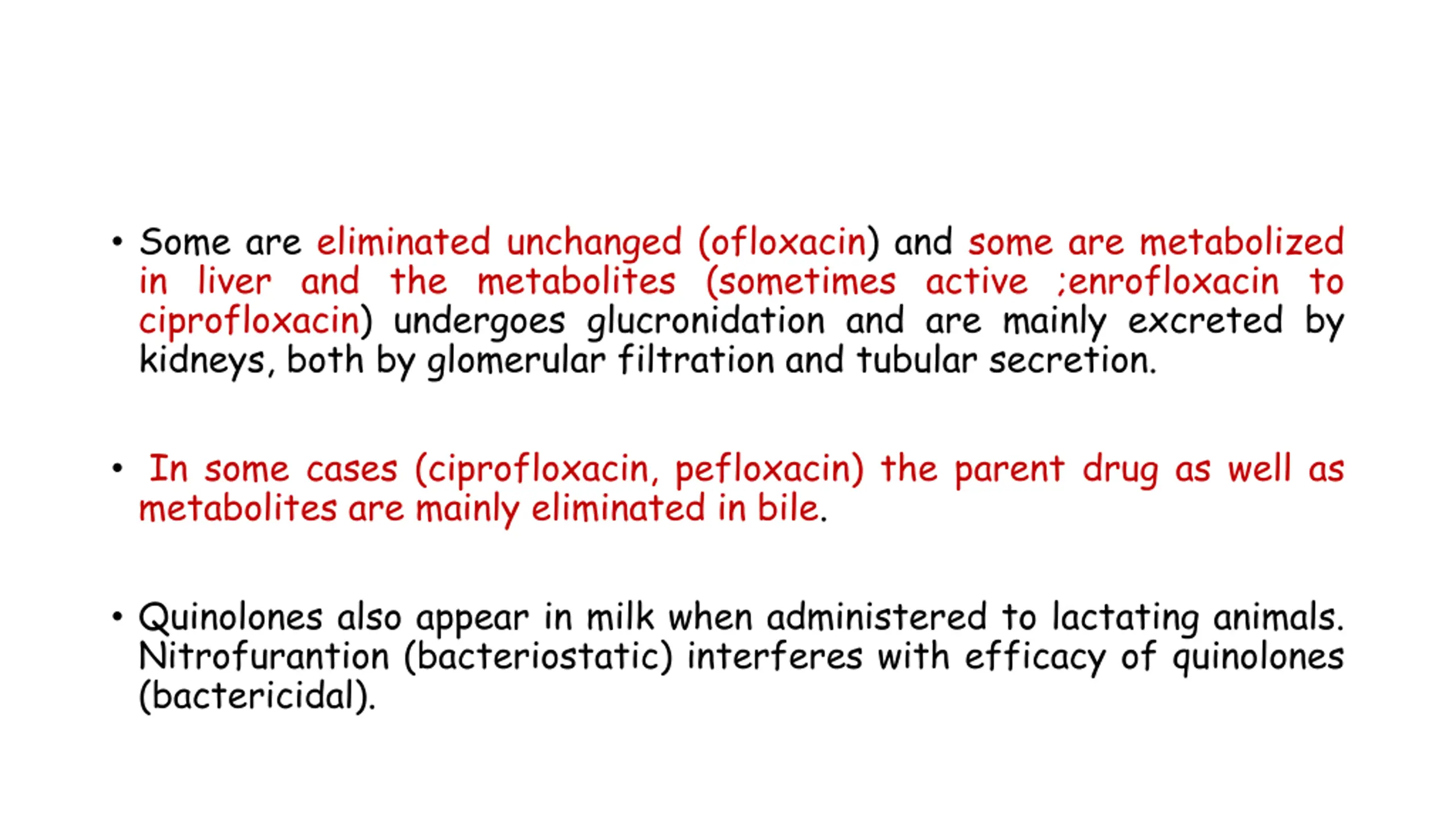 Some are eliminated unchanged (ofloxacin) and some are metabolized in liver and the metabolites (sometimes active ;enrofloxacin to ciprofloxacin) undergoes glucronidation and are mainly excreted by kidneys, both by glomerular filtration and tubular secretion. In some cases (ciprofloxacin, pefloxacin) the parent drug as well as metabolites are mainly eliminated in bile. Quinolones also appear in milk when administered to lactating animals. Nitrofurantion (bacteriostatic) interferes with efficacy of quinolones (bactericidal).
