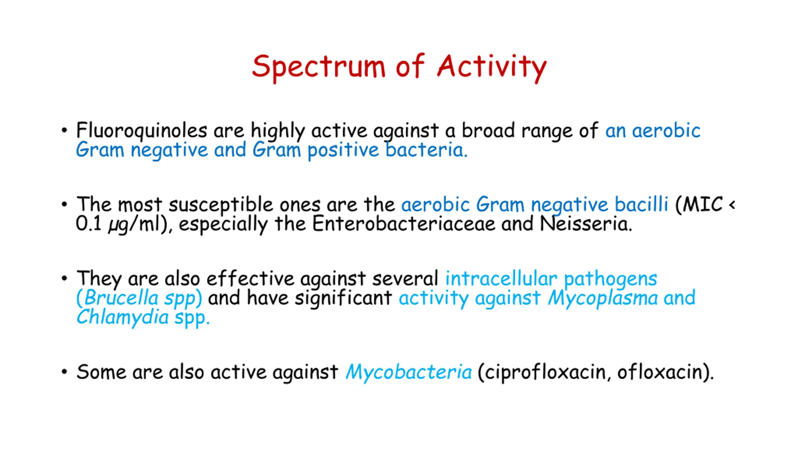 Spectrum of Activity Fluoroquinoles are highly active against a broad range of an aerobic Gram negative and Gram positive bacteria. The most susceptible ones are the aerobic Gram negative bacilli (MIC < 0.1 g/ml), especially the Enterobacteriaceae and Neisseria. They are also effective against several intracellular pathogens (Brucella spp) and have significant activity against Mycoplasma and Chlamydia spp. Some are also active against Mycobacteria (ciprofloxacin, ofloxacin).