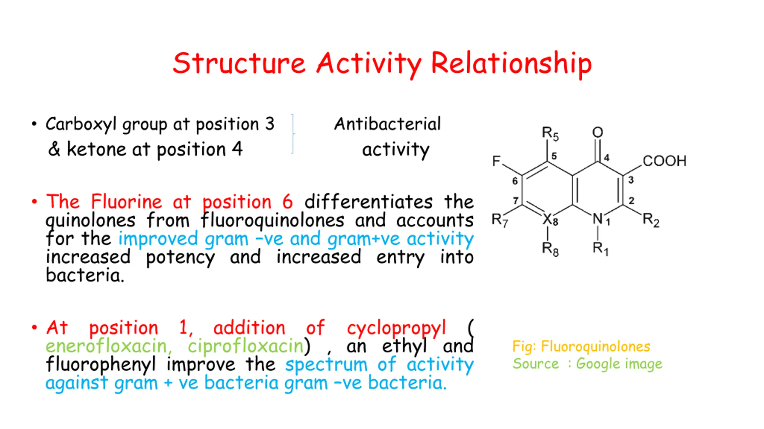 Structure Activity Relationship Carboxyl group at position 3 & ketone at position 4 Antibacterial activity The Fluorine at position 6 differentiates the quinolones from fluoroquinolones and accounts for the improved gram ve and gram+ve activity increased potency and increased entry into bacteria. At enerofloxacin, ciprofloxacin) , an ethyl and fluorophenyl improve the spectrum of activity against gram + ve bacteria gram ve bacteria. position 1, addition of cyclopropyl ( Fig: Fluoroquinolones Source : Google image