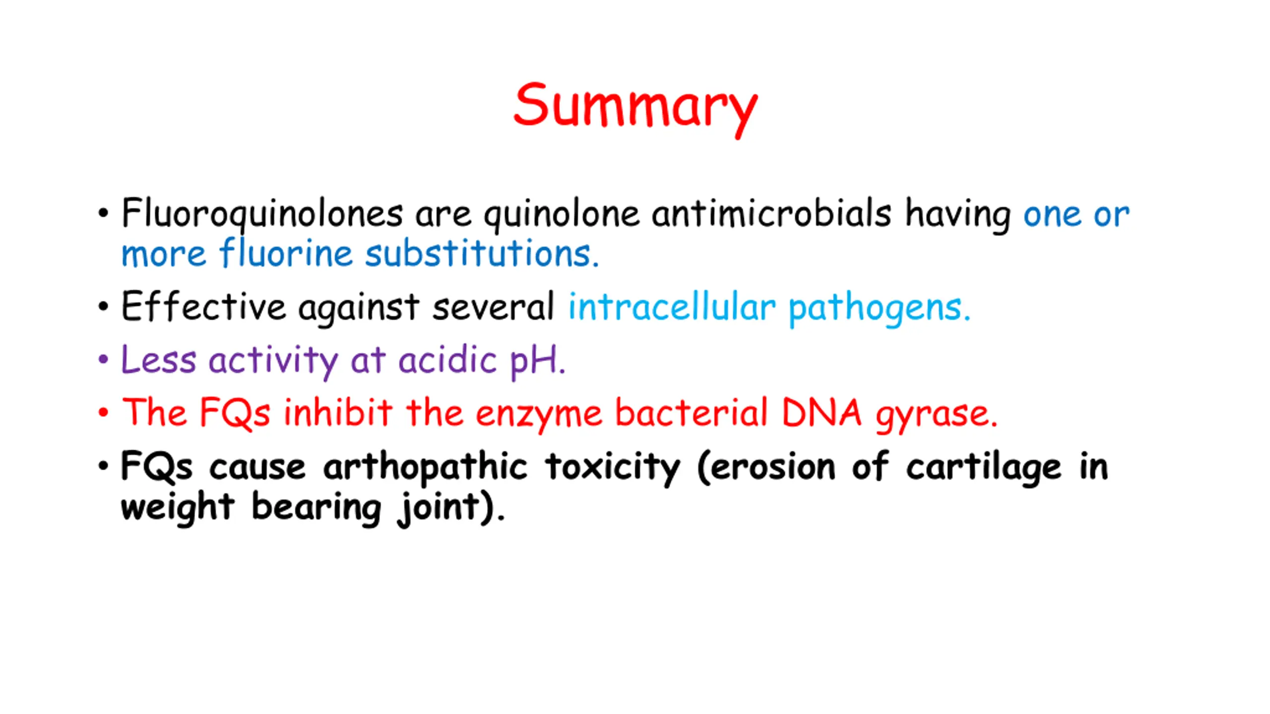 Summary Fluoroquinolones are quinolone antimicrobials having one or more fluorine substitutions. Effective against several intracellular pathogens. Less activity at acidic pH. The FQs inhibit the enzyme bacterial DNA gyrase. FQs cause arthopathic toxicity (erosion of cartilage in weight bearing joint).