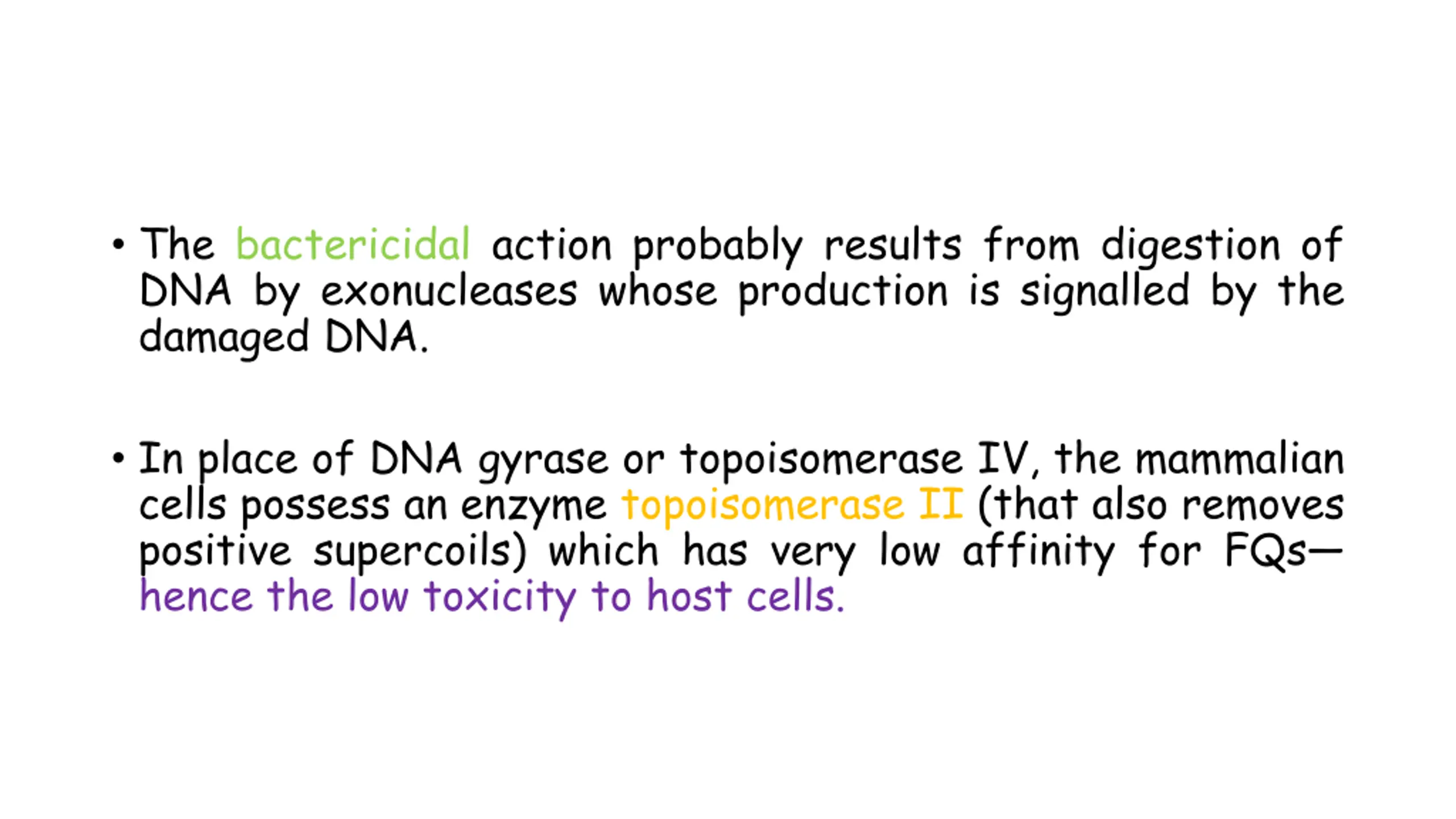The bactericidal action probably results from digestion of DNA by exonucleases whose production is signalled by the damaged DNA. In place of DNA gyrase or topoisomerase IV, the mammalian cells possess an enzyme topoisomerase II (that also removes positive supercoils) which has very low affinity for FQs hence the low toxicity to host cells.