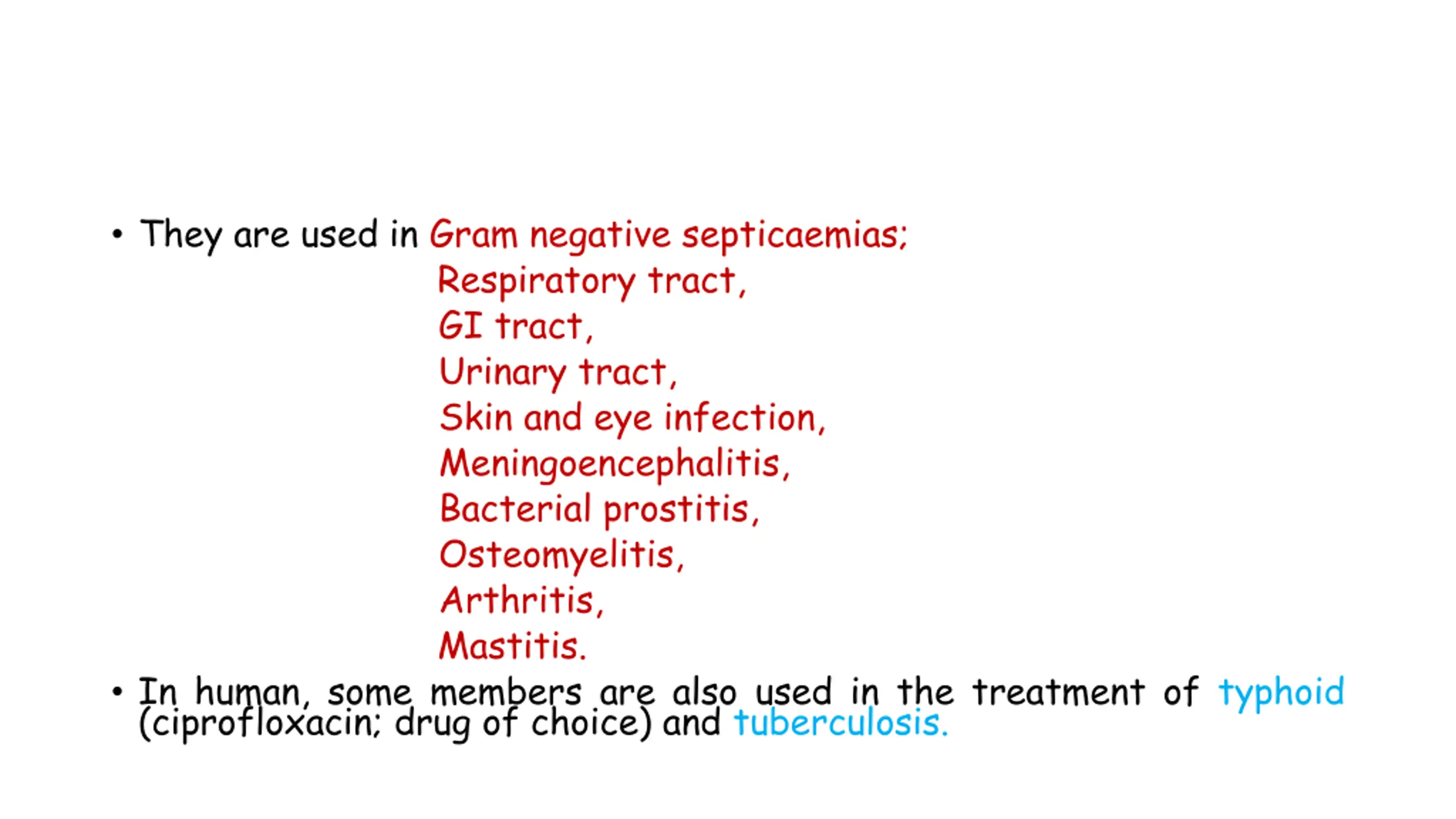 They are used in Gram negative septicaemias; Respiratory tract, GI tract, Urinary tract, Skin and eye infection, Meningoencephalitis, Bacterial prostitis, Osteomyelitis, Arthritis, Mastitis. In human, some members are also used in the treatment of typhoid (ciprofloxacin; drug of choice) and tuberculosis.