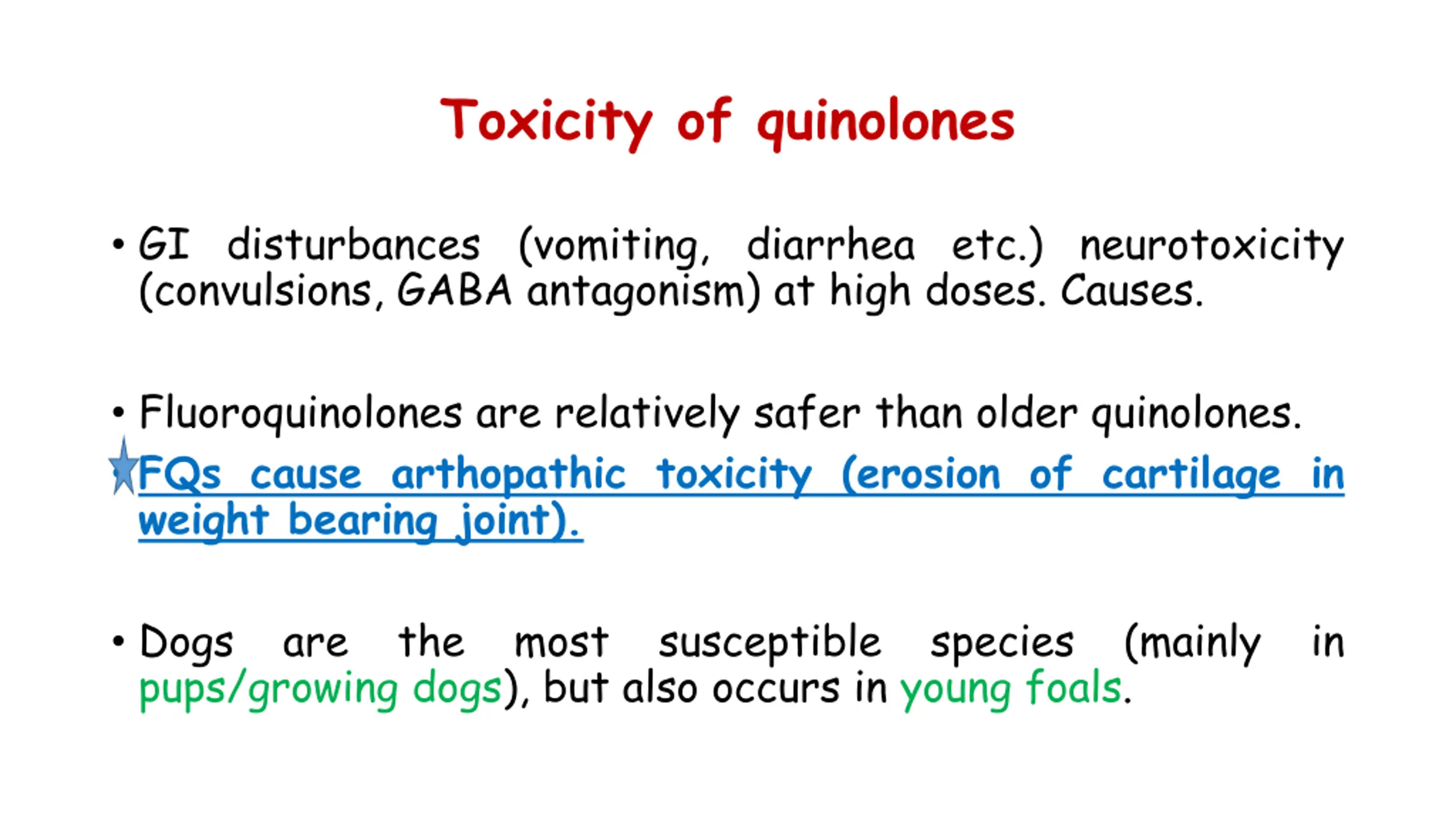 Toxicity of quinolones GI disturbances (vomiting, diarrhea etc.) neurotoxicity (convulsions, GABA antagonism) at high doses. Causes. Fluoroquinolones are relatively safer than older quinolones. FQs cause arthopathic toxicity (erosion of cartilage in weight bearing joint). Dogs are the most susceptible species (mainly in pups/growing dogs), but also occurs in young foals.