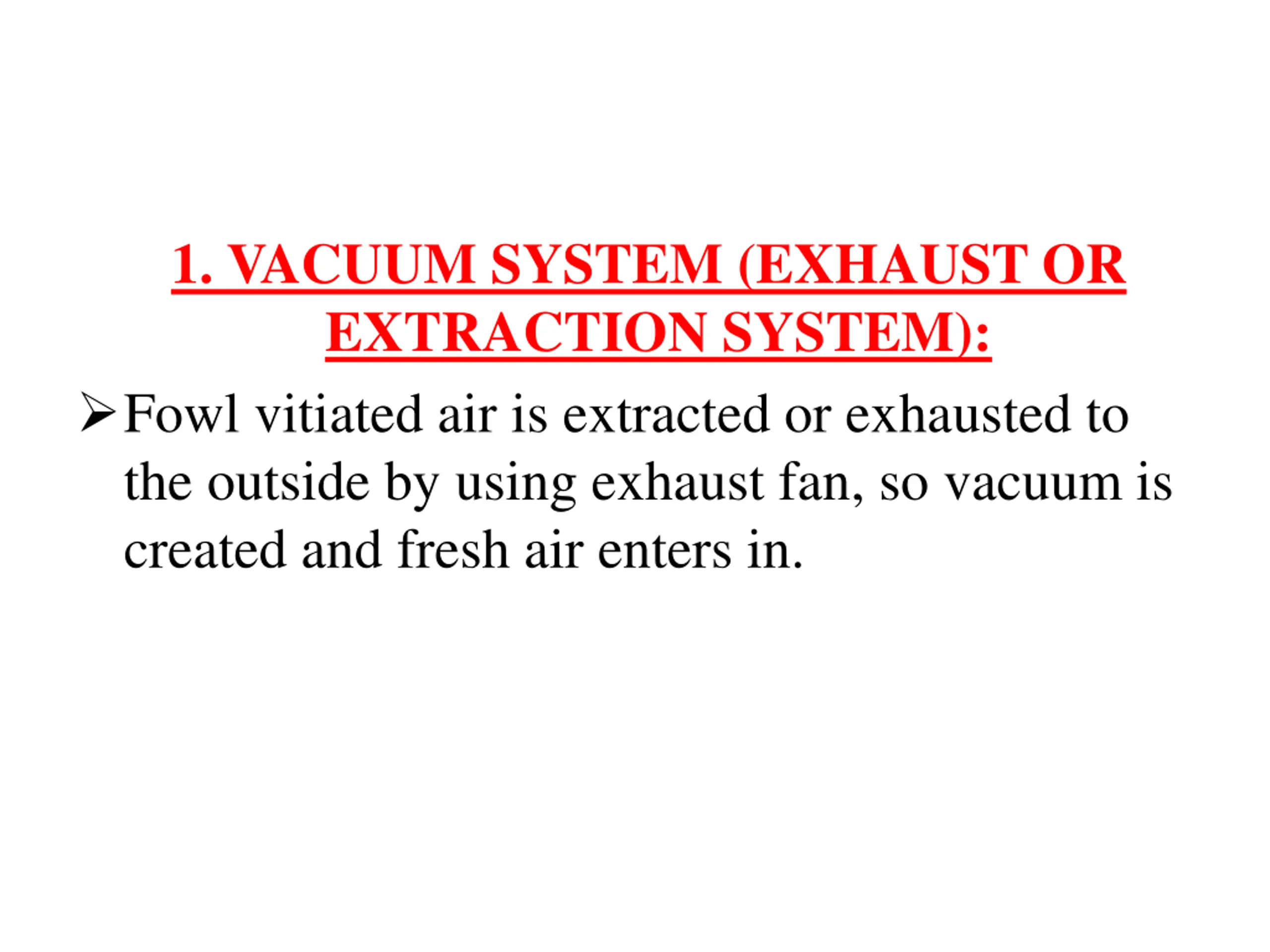 1. VACUUM SYSTEM (EXHAUST OR EXTRACTION SYSTEM): Fowl vitiated air is extracted or exhausted to the outside by using exhaust fan, so vacuum is created and fresh air enters in.
