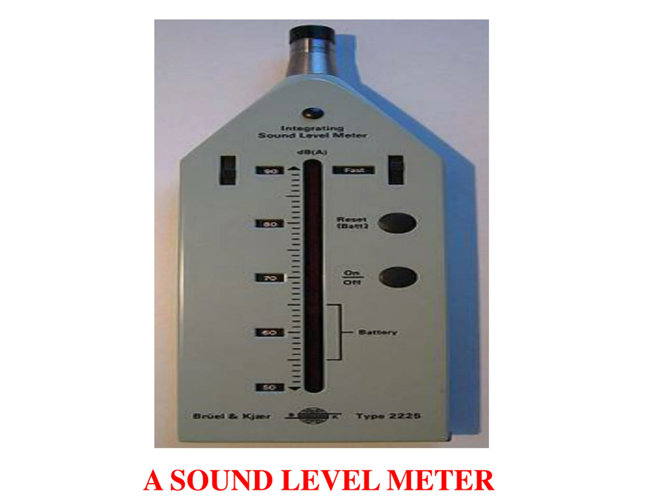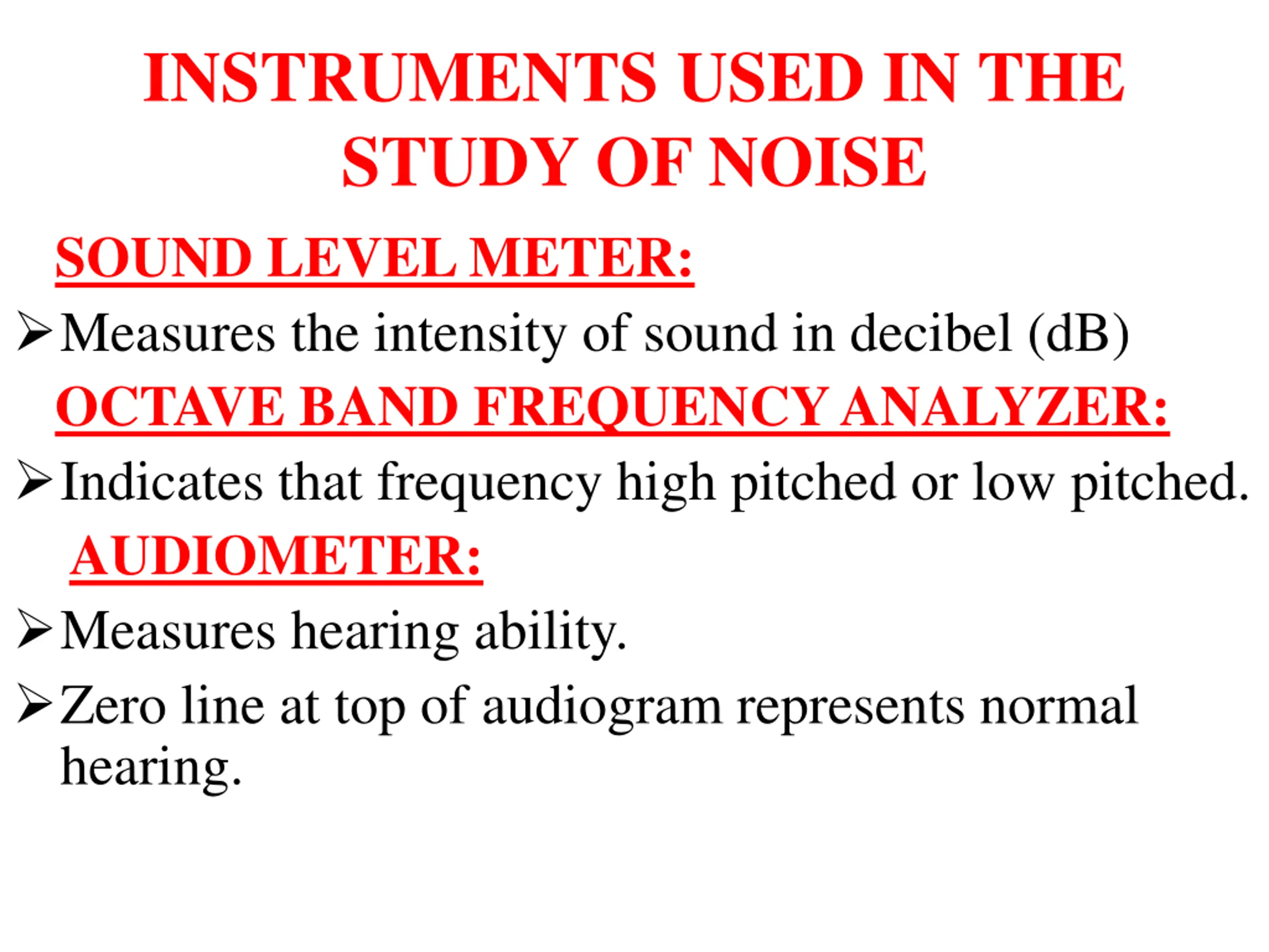 INSTRUMENTS USED IN THE STUDY OF NOISE SOUND LEVEL METER: Measures the intensity of sound in decibel (dB) OCTAVE BAND FREQUENCY ANALYZER: Indicates that frequency high pitched or low pitched. AUDIOMETER: Measures hearing ability. Zero line at top of audiogram represents normal hearing.