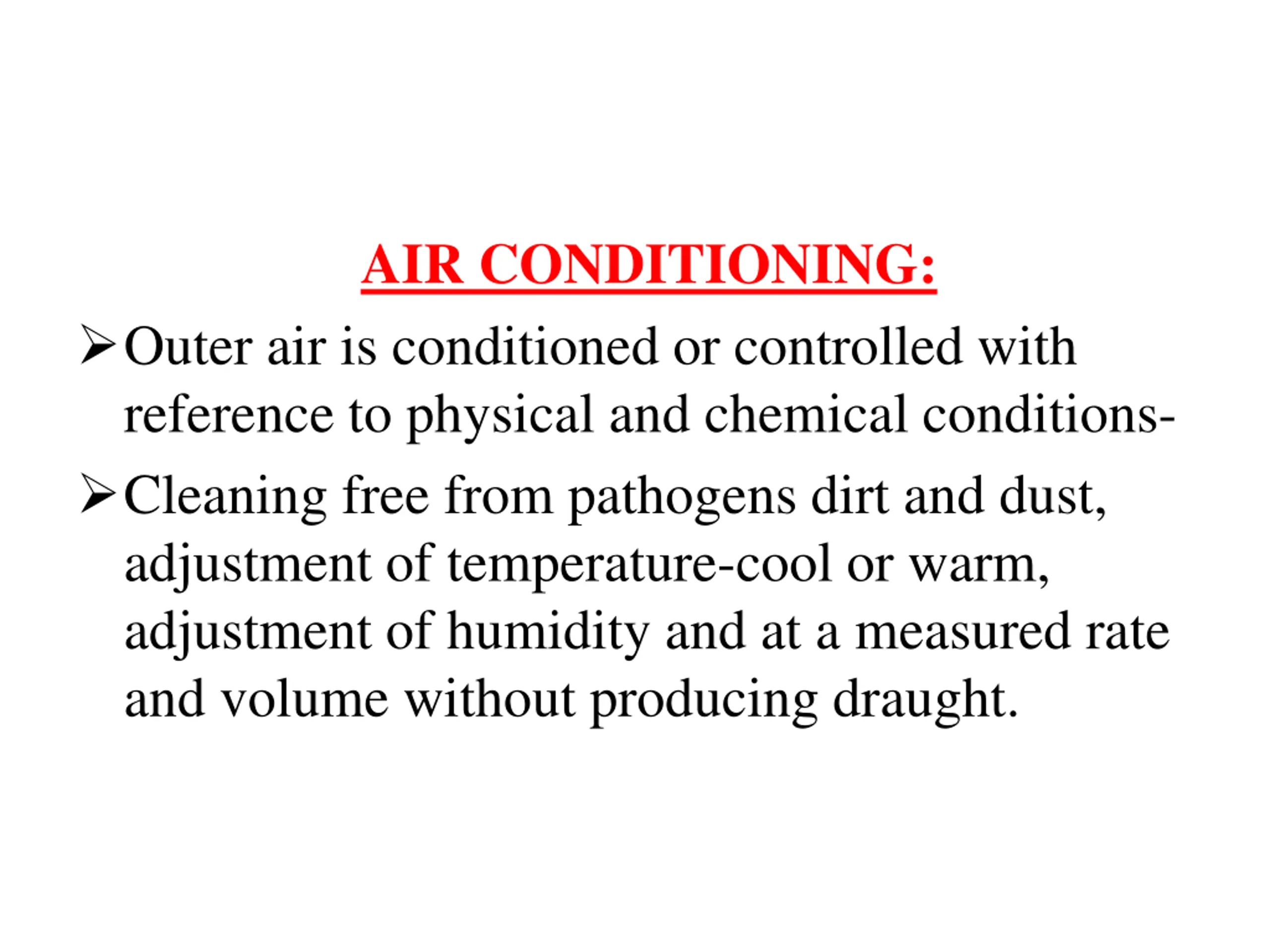 AIR CONDITIONING: Outer air is conditioned or controlled with reference to physical and chemical conditions- Cleaning free from pathogens dirt and dust, adjustment of temperature-cool or warm, adjustment of humidity and at a measured rate and volume without producing draught.