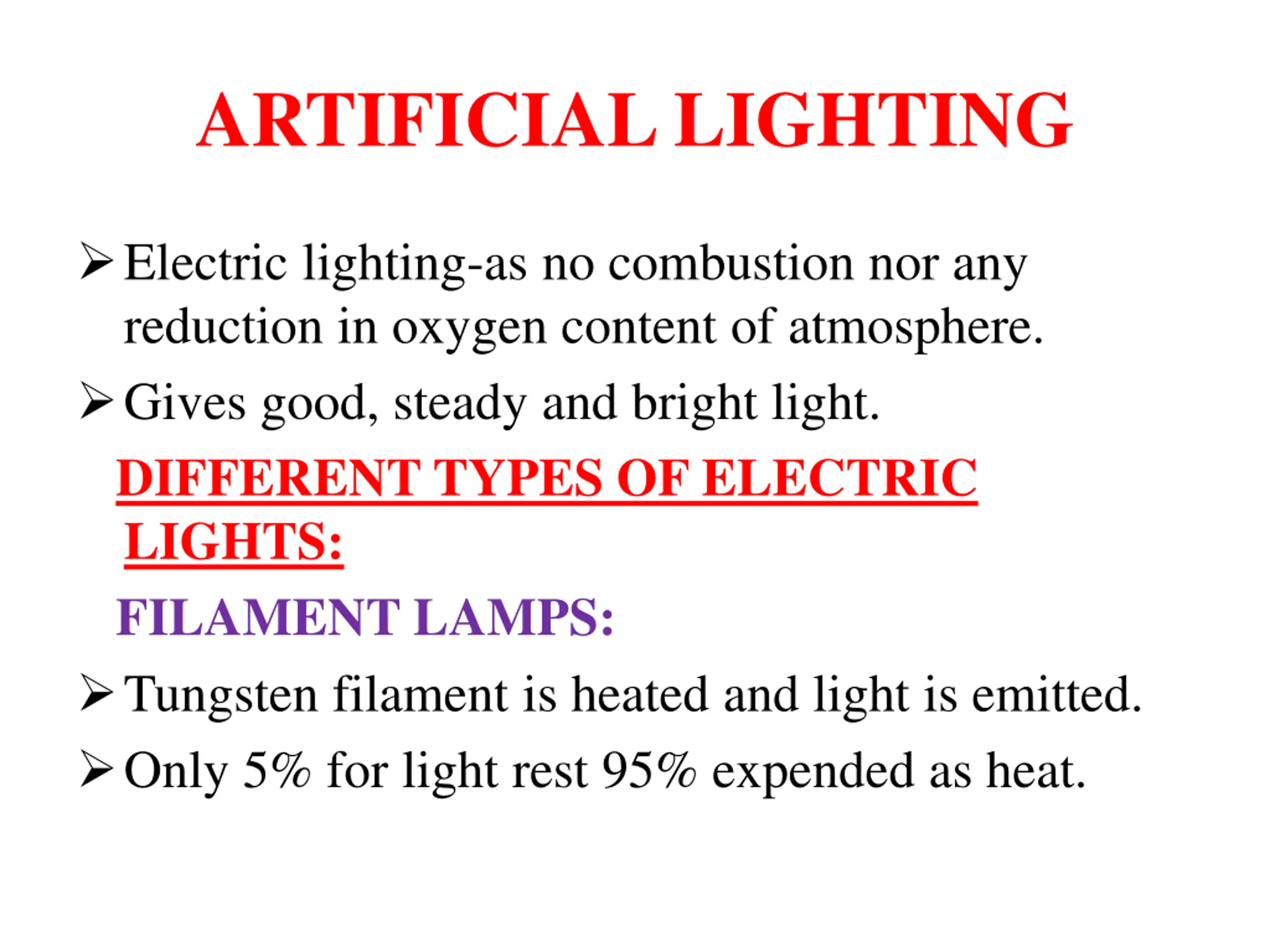 ARTIFICIAL LIGHTING Electric lighting-as no combustion nor any reduction in oxygen content of atmosphere. Gives good, steady and bright light. DIFFERENT TYPES OF ELECTRIC LIGHTS: FILAMENT LAMPS: Tungsten filament is heated and light is emitted. Only 5% for light rest 95% expended as heat.